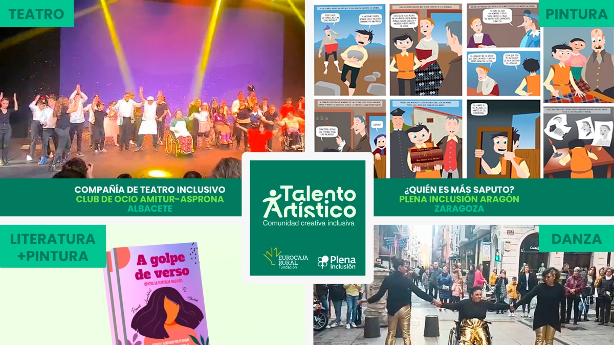 ‘Talento Artístico’ es una convocatoria promovida por Fundación Eurocaja Rural y Plena inclusión España para apoyar iniciativas culturales inclusivas en fase de desarrollo o ejecución. Esta edición, dirigida al entorno asociativo de Plena inclusión, ha otorgado cuatro ayudas de 2.000 euros a proyectos que destacan por su creatividad y su capacidad para generar impacto social.