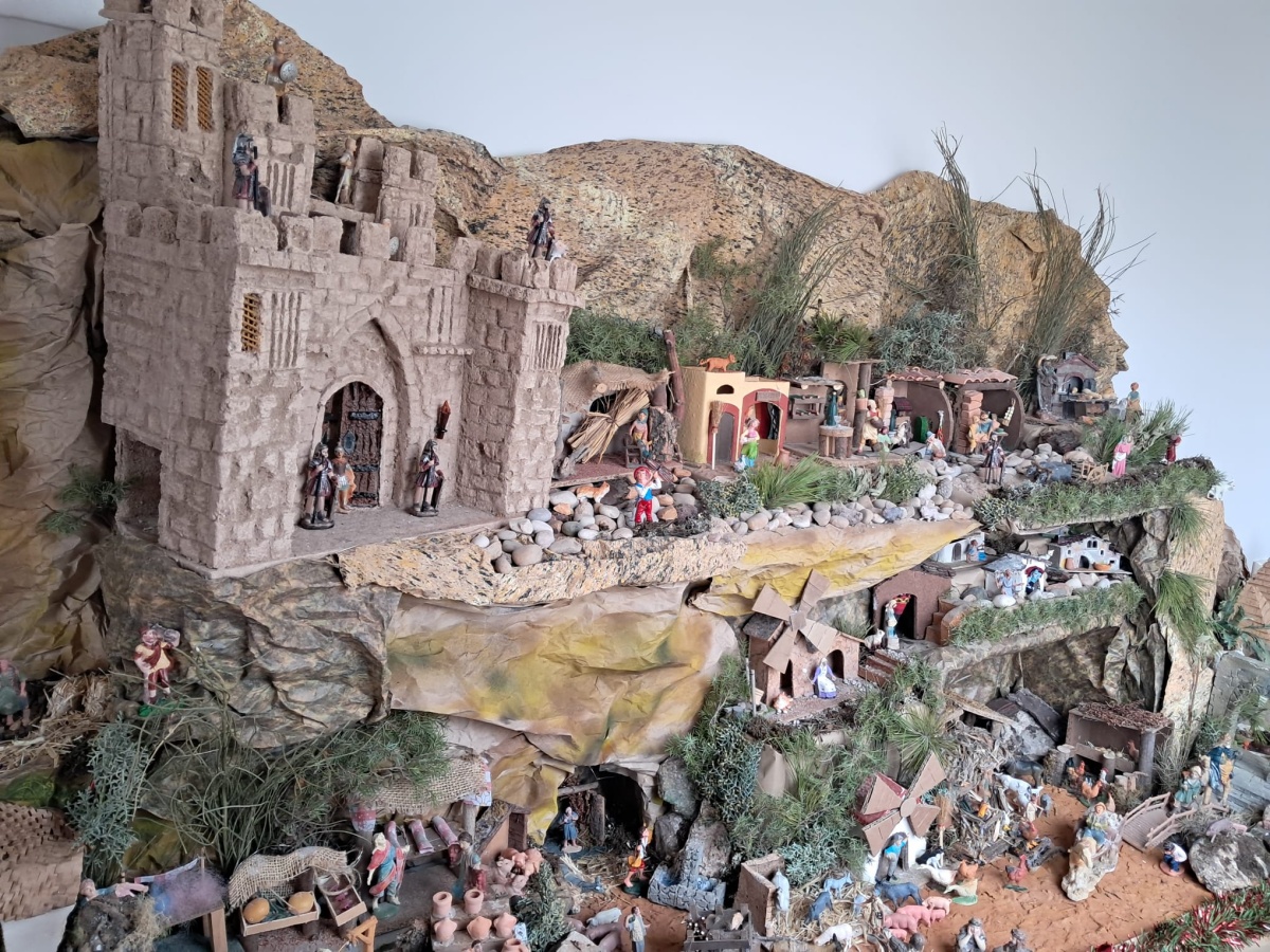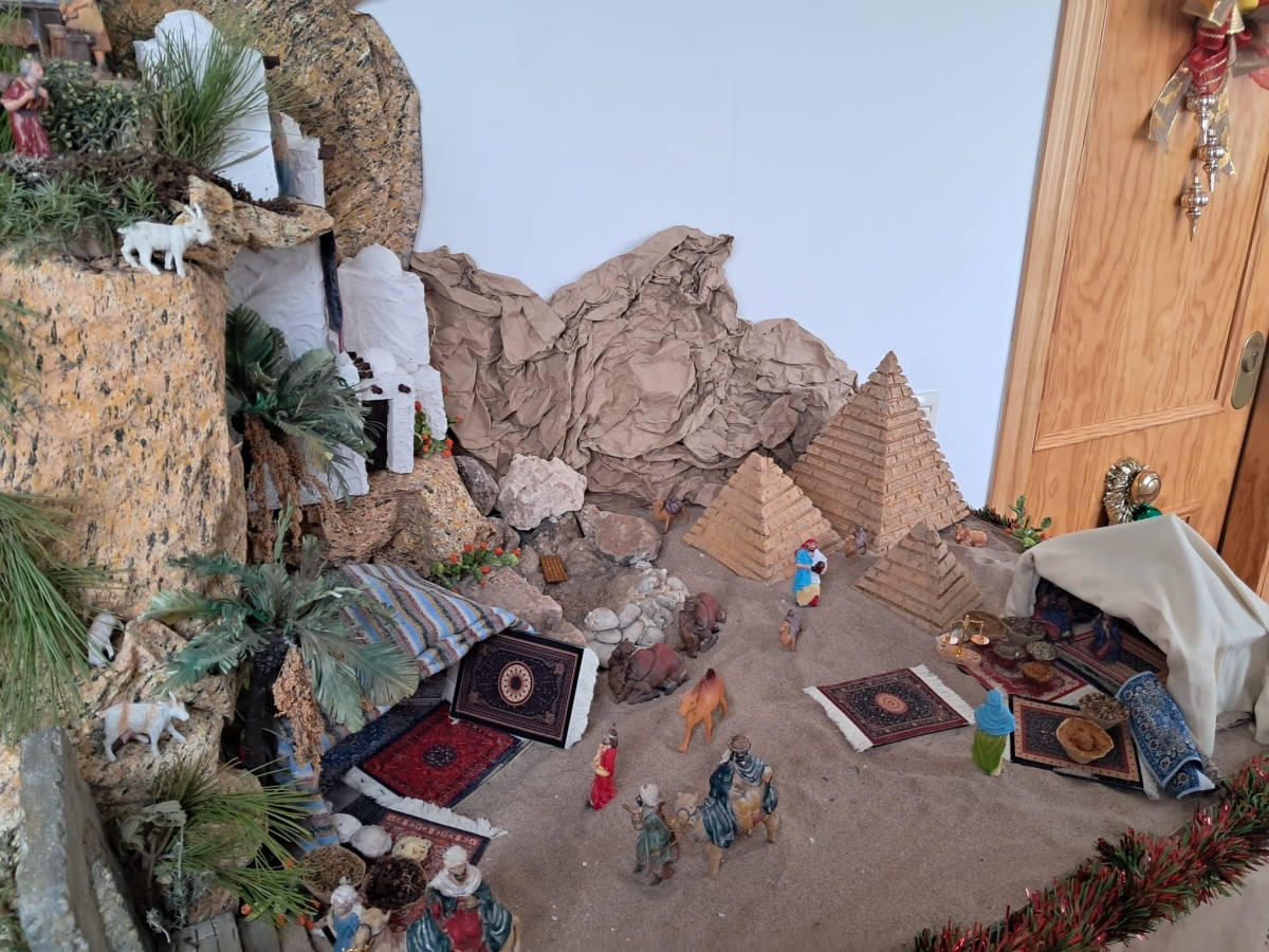 Eso sí, a este Belén no le falta detalle, ni guiños a su tierra. “Hemos puesto tela manchega para las ventanas”, apunta, y explica que hasta “arena de la playa” tiene el castillo de su Belén. Además, cuenta con una noria y hasta con las pirámides de Egipto representadas en una de sus escenas, así como viñas y representaciones de los oficios antiguos. “Mi hermana ha hecho un horno de alfarero, muy bonito, y también un gallinero”, manifiesta. Y es que como decimos, este Belén se caracteriza por ser especialmente colaborativo, por lo que “muchas vecinas también cuando van de viaje se acuerdan y traen figuritas de diferentes sitios”.