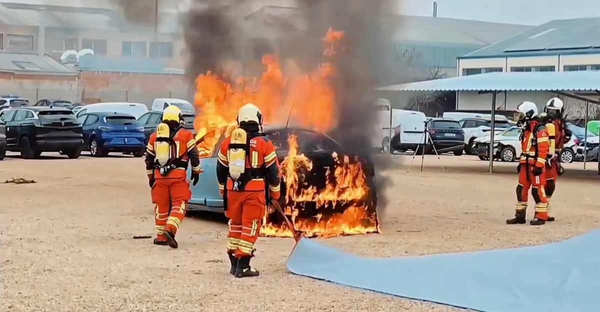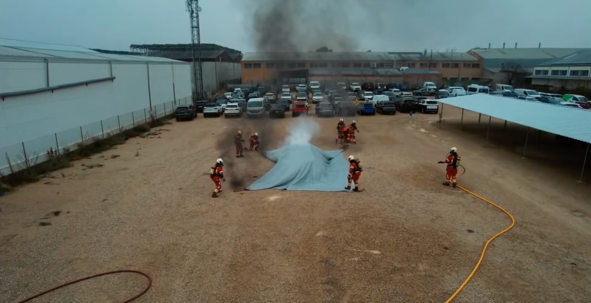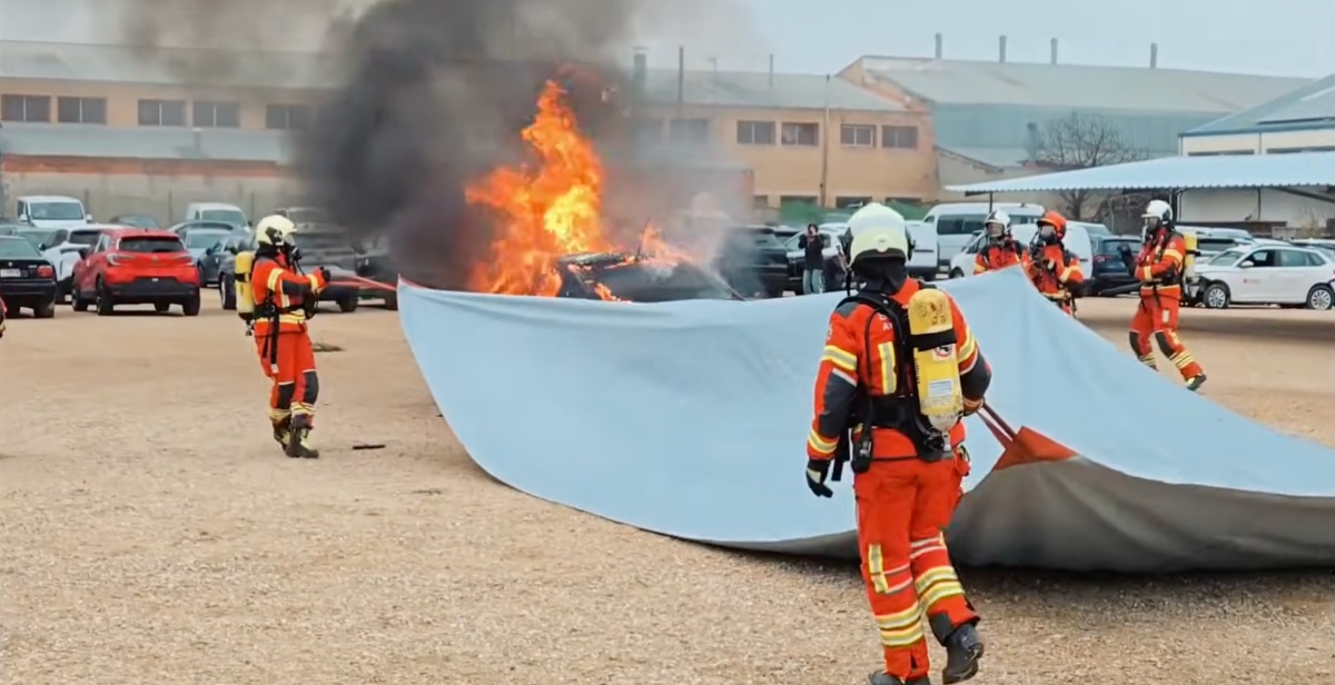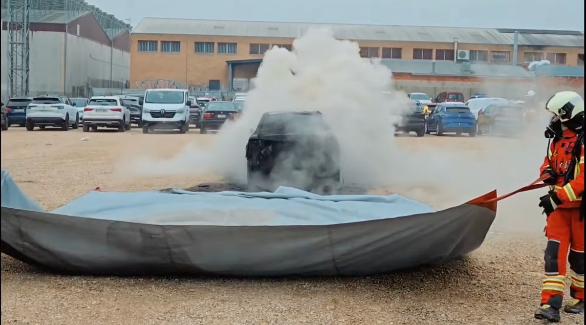 La secuencia más llamativa de los vídeos muestra el momento en el que el vehículo es cubierto por completo con la manta, diseñada para aislar el foco del incendio y limitar la entrada de oxígeno. Esta técnica permite reducir la propagación de las llamas y aumentar la seguridad de los intervinientes, especialmente en incendios donde las baterías de litio pueden reactivarse y prolongar la emergencia.