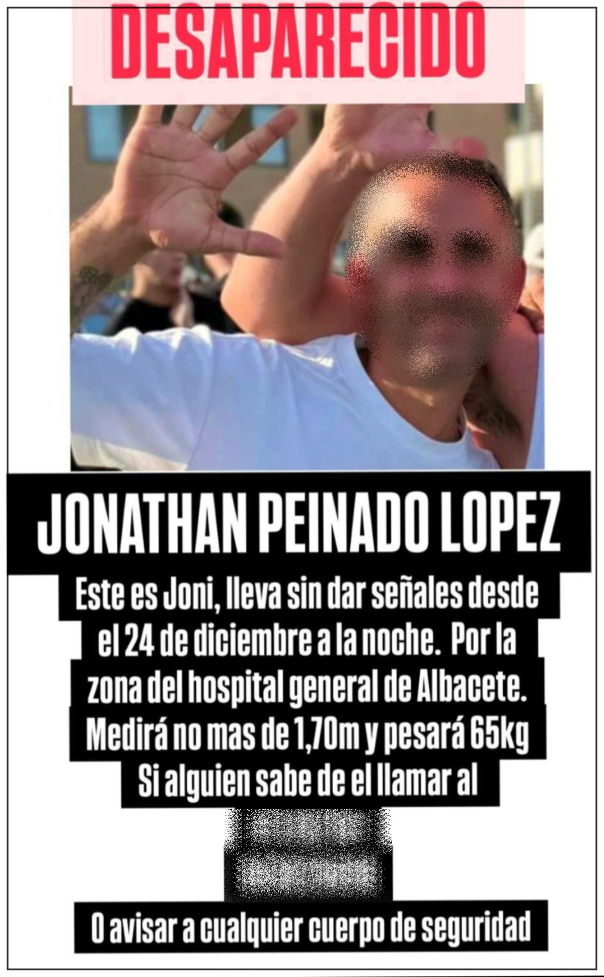 Tal y como informó este medio en la jornada de ayer domingo, la familia y allegados de Jonathan Peinado López, conocido como “Joni”, habían difundido una alerta de búsqueda tras su desaparición en Albacete en la noche de Nochebuena (24 de diciembre).