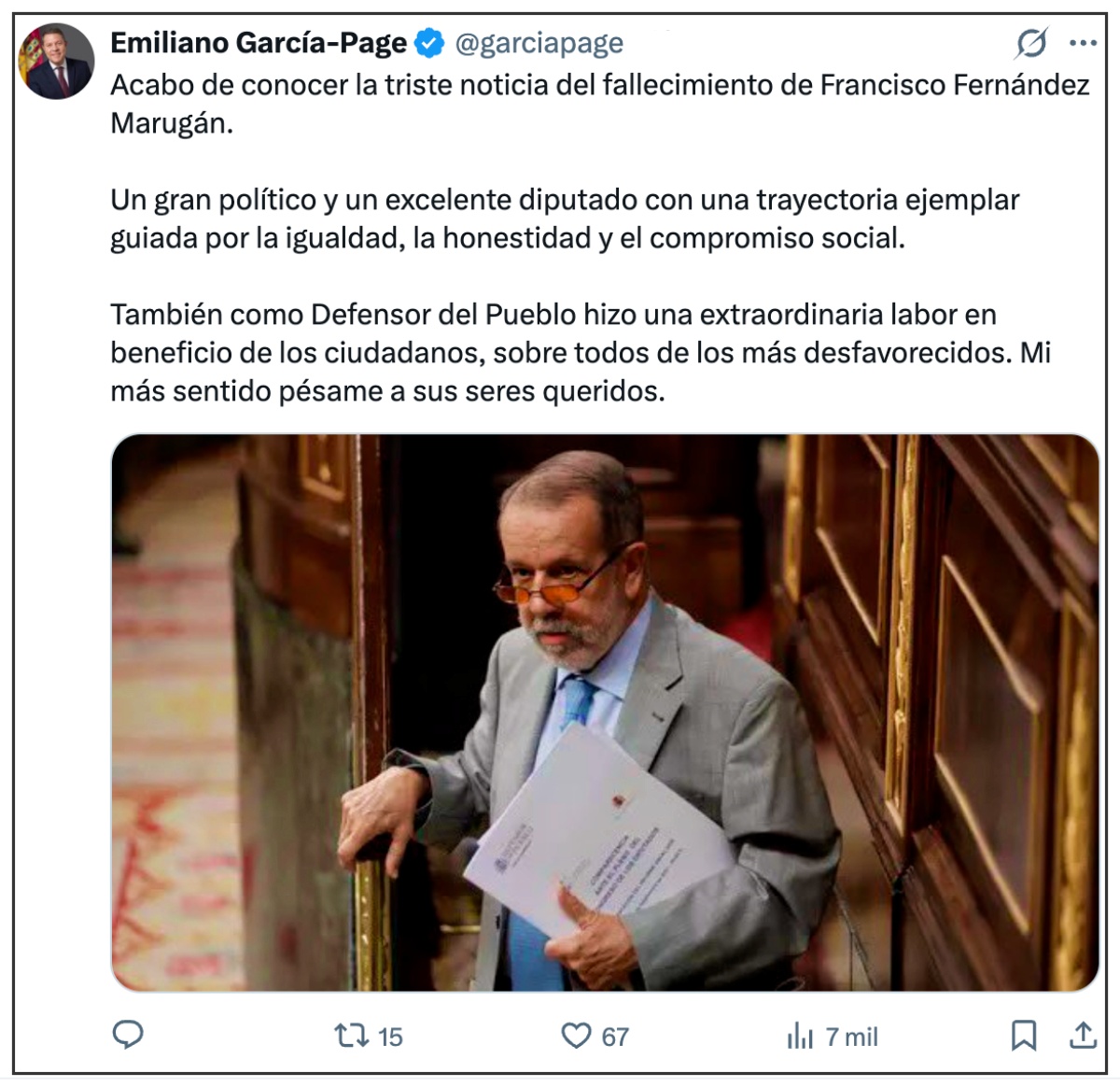 En redes sociales se han sucedido los pésames y las muestras de afecto de compañeros socialistas, como el presidente catellanomanchego, Emiliano García-Page, quien lo ha calificado de «gran político y excelente diputado» y ha elogiado su «trayectoria ejemplar guiada por la igualdad, la honestidad y el compromiso social.»