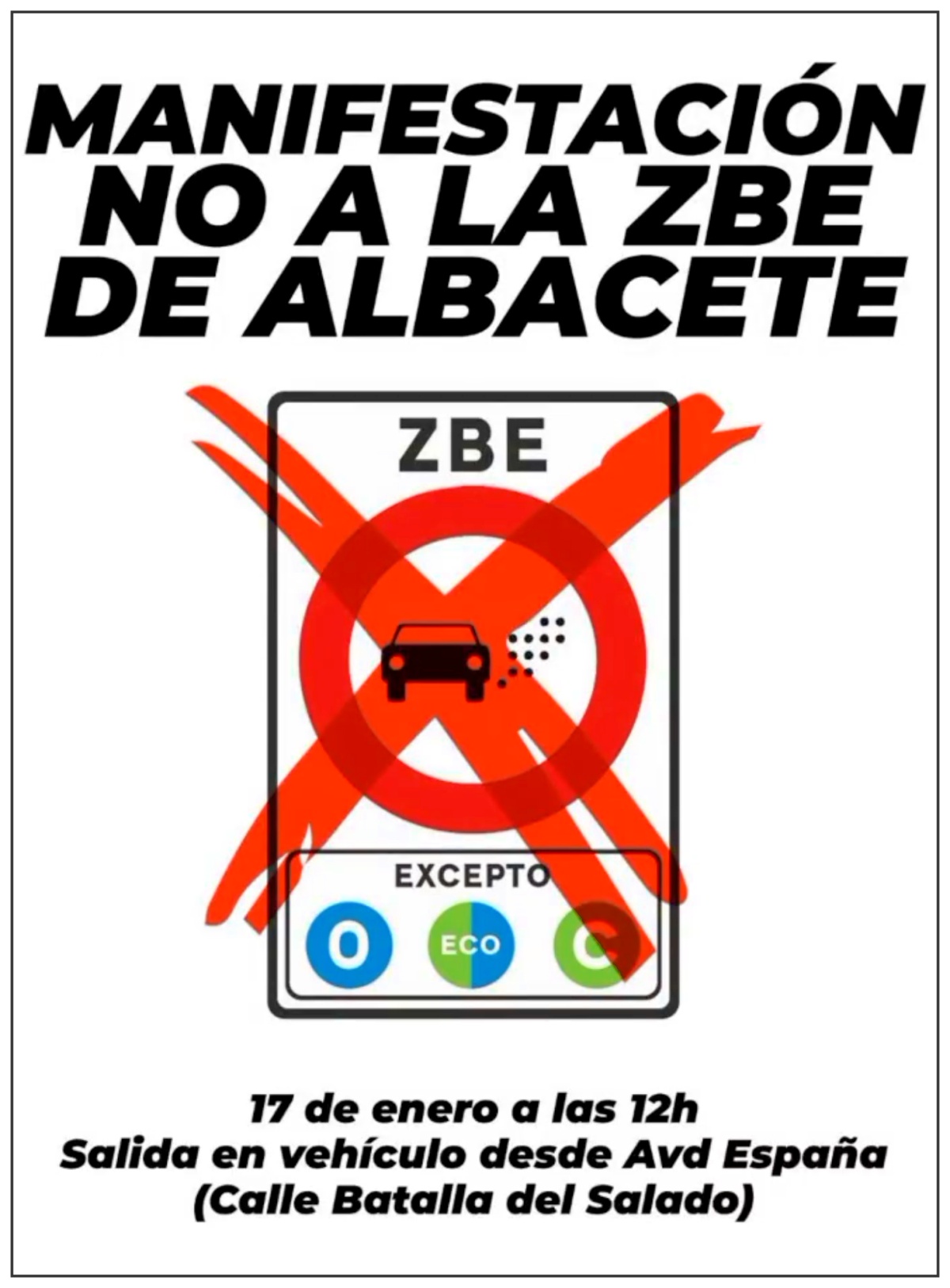 De este modo, Albacete tiene ya fecha para una nueva protesta vinculada a la movilidad urbana. Según el cartel difundido por los convocantes, el viernes 17 de enero, a las 12.00 horas, se ha convocado en la ciudad una “manifestación” contra la Zona de Bajas Emisiones (ZBE). La marcha se plantea en vehículo y partirá desde la Avenida de España, a la altura de la calle Batalla del Salado, bajo el lema “No a la ZBE de Albacete”.