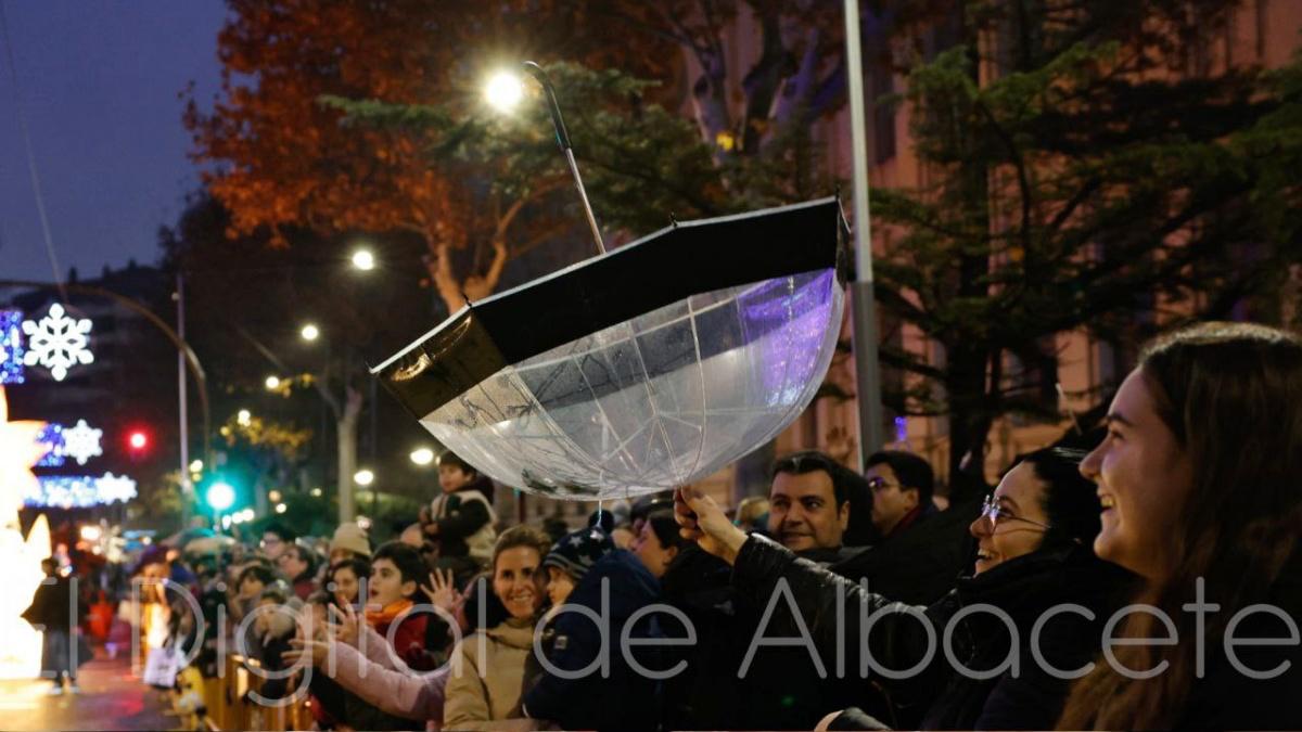 Ni la lluvia, ni el cielo encapotado, ni las previsiones de frío han logrado deslucir la noche más mágica del año en Albacete. La Cabalgata de los Reyes Magos ha vuelto a celebrarse este 5 de enero demostrando que, cuando manda la ilusión, la meteorología pasa a un segundo plano. Y si no, basta con fijarse en una escena que resume a la perfección el espíritu de esta noche. Una joven alzando su paraguas, pero del revés.