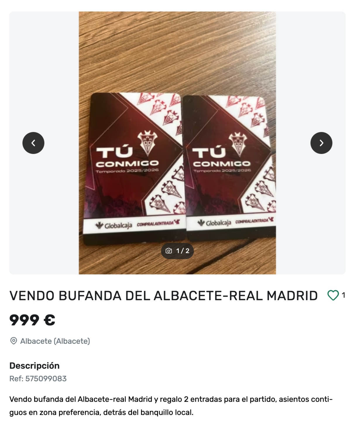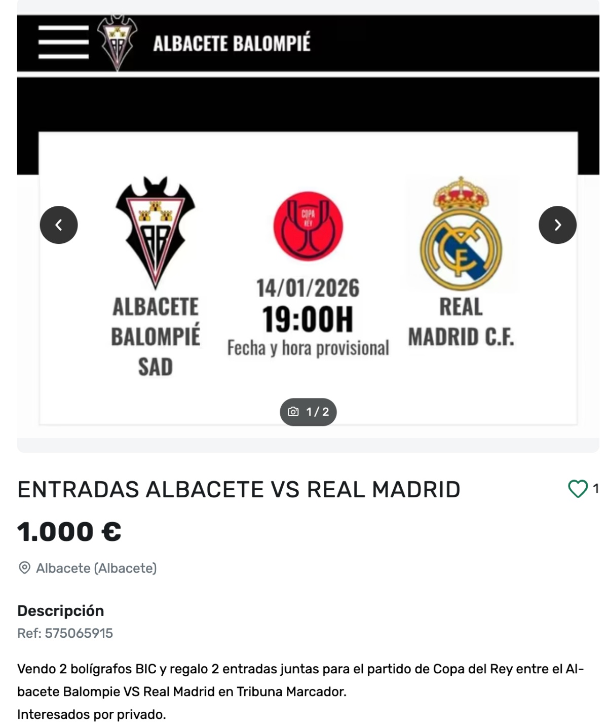Entre los anuncios más llamativos, destaca uno en Milanuncios en el que un vendedor ofrece dos entradas por 1.000 euros, camuflando la operación bajo una fórmula ya conocida: «Vendo dos bolígrafos BIC y regalo dos entradas juntas para el partido de Copa del Rey entre el Albacete Balompié y el Real Madrid en Tribuna Marcador». En la misma plataforma, otro anuncio fija el precio en 999 euros por dos localidades en Preferencia, asegurando que se vende una bufanda del partido y se «regalan» las entradas, situadas detrás del banquillo local.