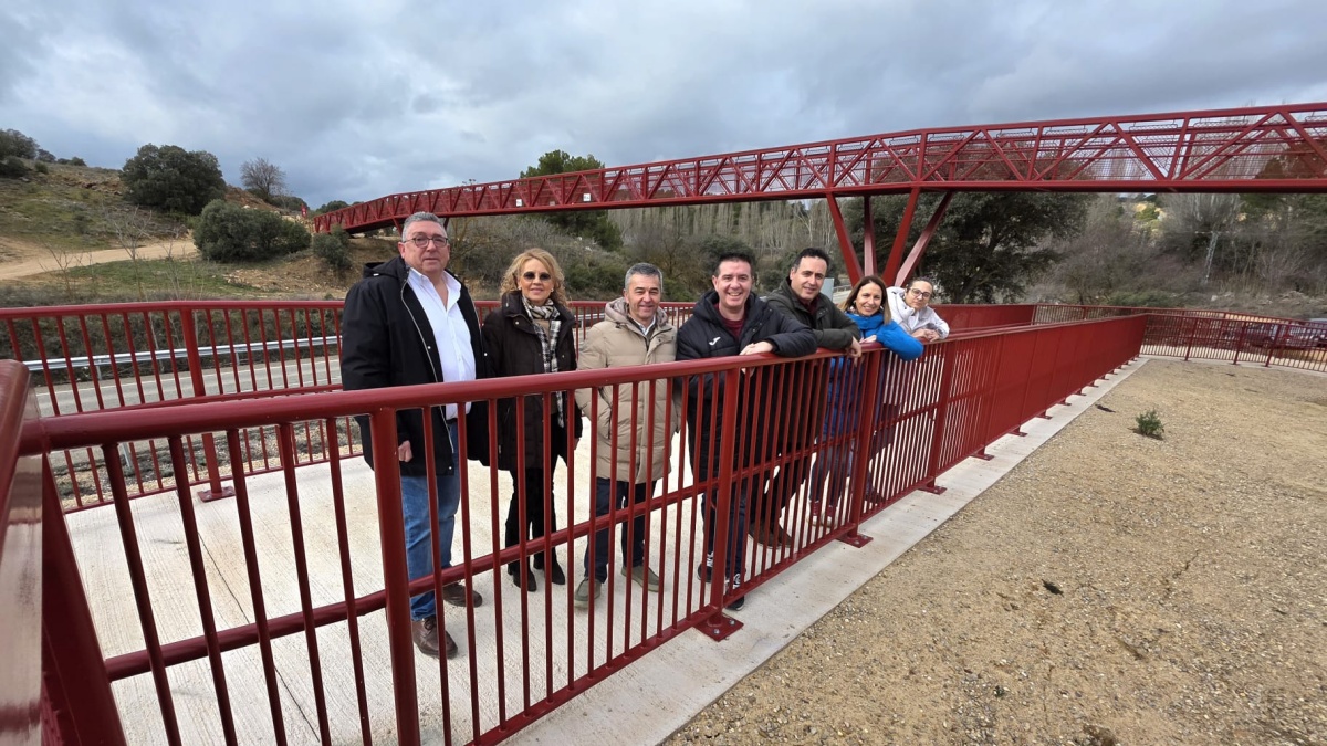 Uno de los elementos más destacados del proyecto es la nueva pasarela peatonal elevada sobre la carretera CM-313, que sustituye un cruce a nivel anterior y elimina un punto de riesgo importante. La estructura, con un vano central de 30 metros y dos laterales de 16 y 23,80 metros, mejora de forma notable la seguridad, la continuidad del itinerario y la experiencia de quienes recorren esta vía verde.