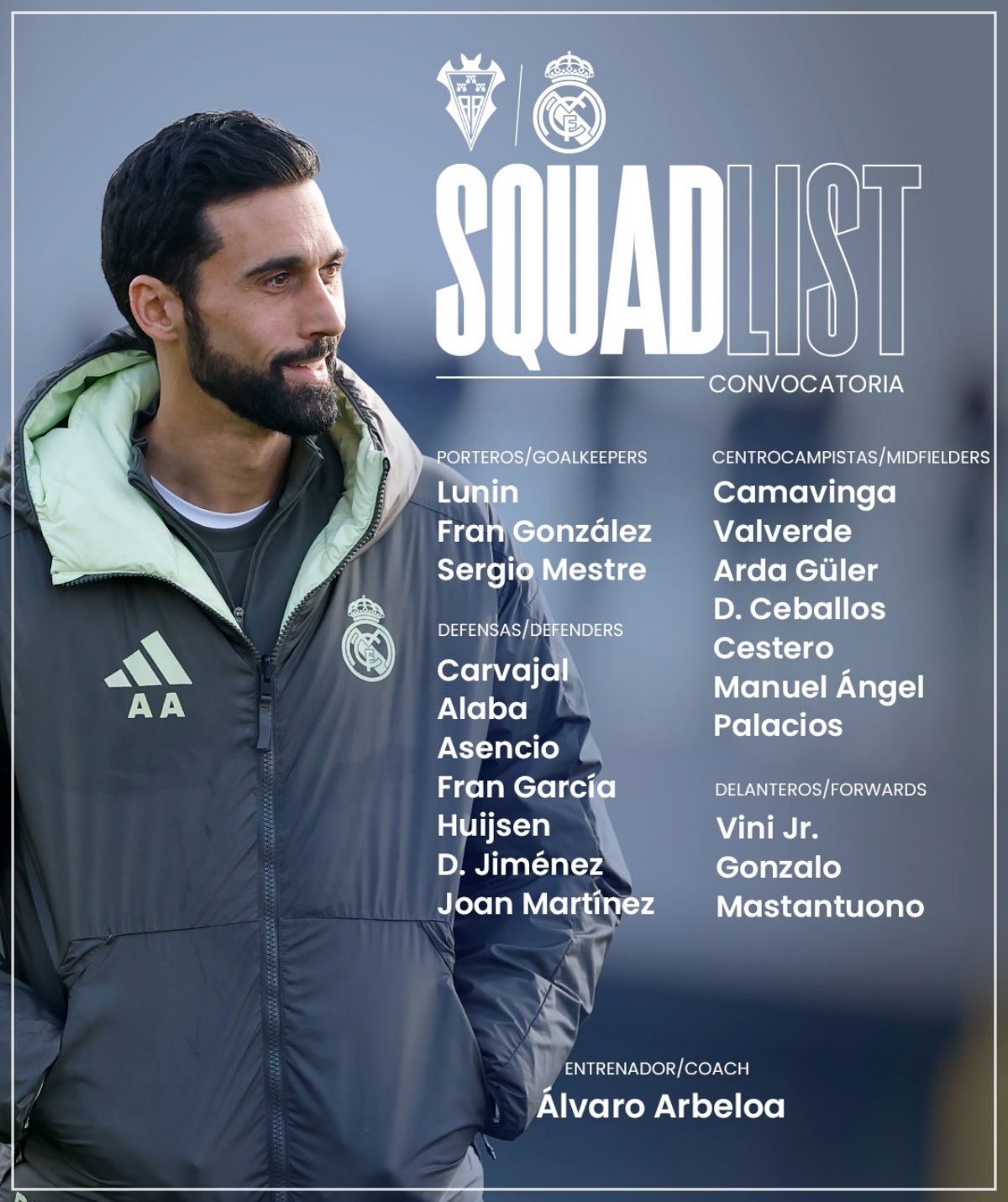 En sentido contrario, sí entran en la relación varios nombres de peso —Lunin, Carvajal, Alaba, Camavinga, Valverde, Arda Güler, Ceballos y Vini Jr., entre otros— junto a jóvenes como Fran González, Sergio Mestre, David Jiménez, Joan Martínez, Cestero, Manuel Ángel y Palacios, además de Gonzalo y Mastantuono en ataque.