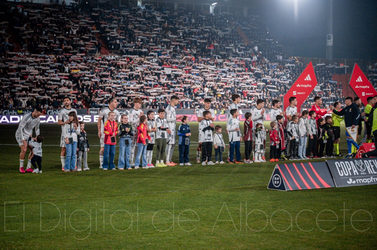 Bufanda en mano y levantados de sus asientos recibía la afición los jugadores del Albacete Balompié y Real Madrid en el instante en el que saltaban al campo para medirse en un duelo inolvidable. Pero sin duda, un momento mágico y que ponía la piel de gallina era el instante en el que la afición entonaba el himno del Alba.