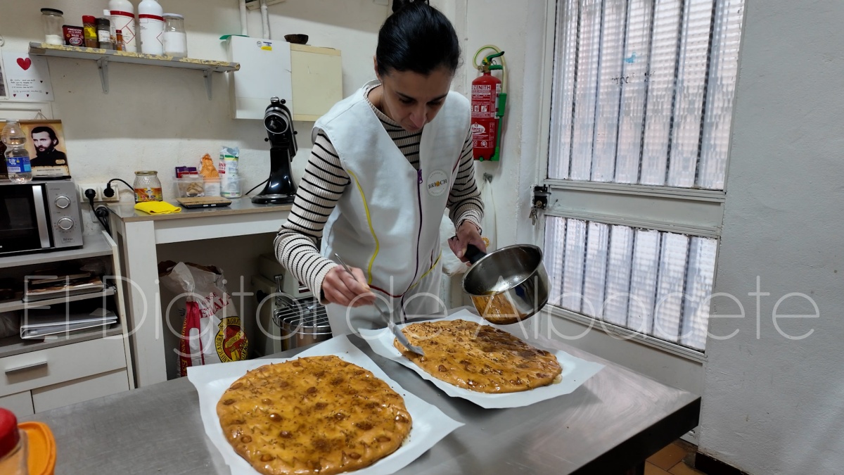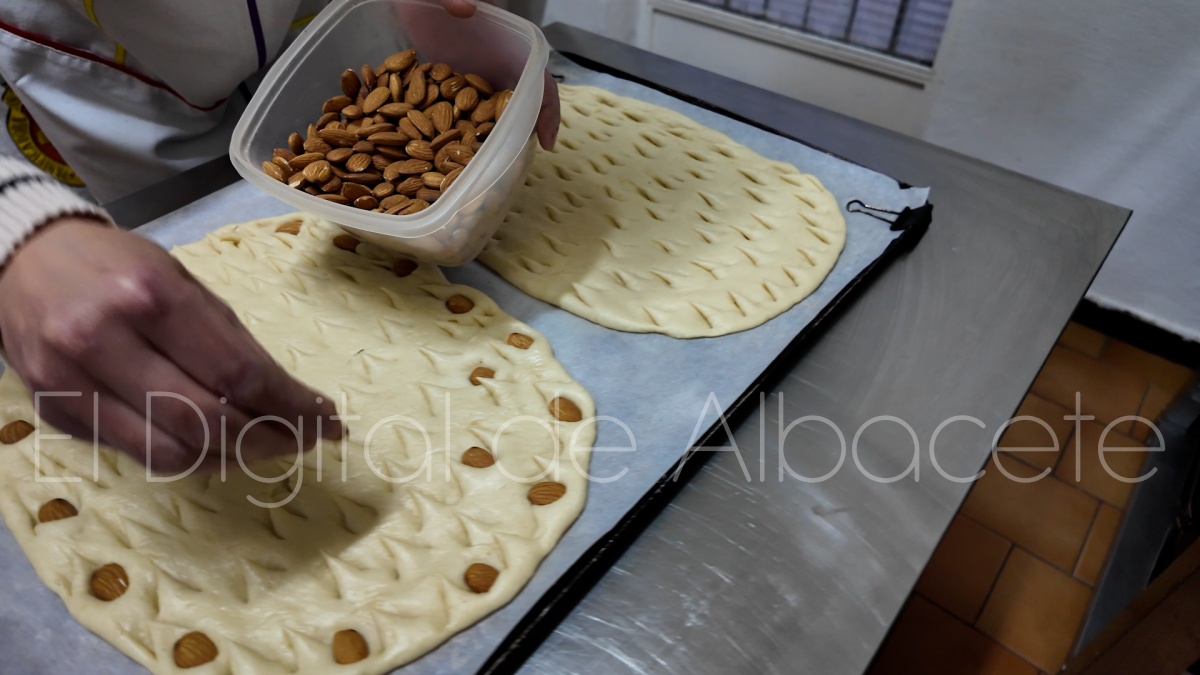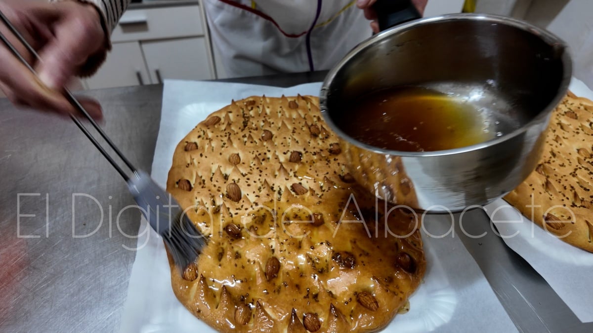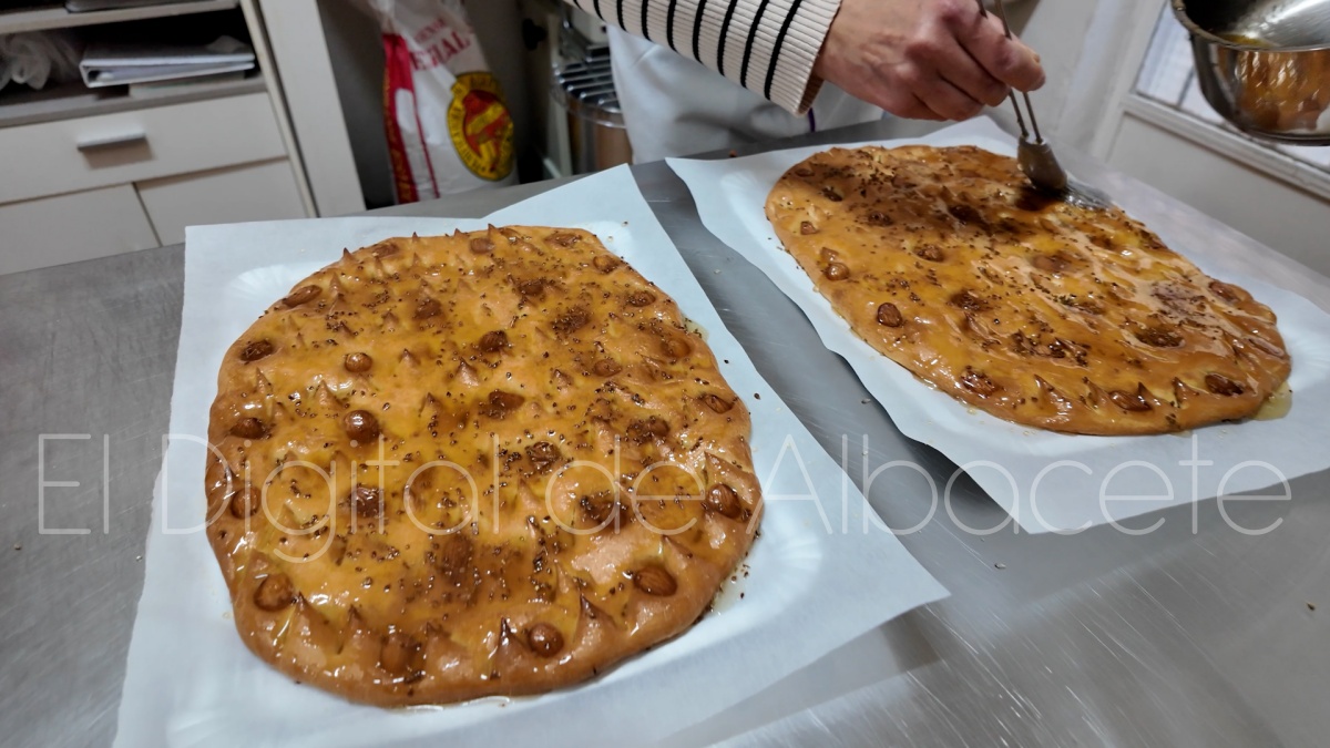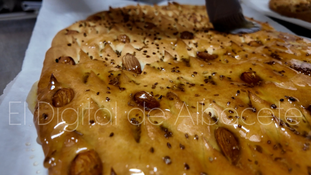 Hace unos años, la pastelería ‘Brioch’ de Casas Ibáñez recuperó la receta tradicional del Pan Bendito. Florentina Feraru, de la pastelería ‘Brioch’, explica que “este dulce consiste en una torta de masa de pan elaborada con aceite, harina, manteca, levadura, huevo, sal, y agua. Se mezclan todos los ingredientes en la amasadora durante unos 10 minutos, hasta conseguir una masa fina. Una vez conseguida esa textura se deja fermentar unos 15 minutos. Cuando ya está fermentada la masa, la dividimos en porciones de unos 500 gramos para luego amasarlas en forma de bola. Luego la extendemos con un rodillo, y se deja en un sitio cálido para que suba su volumen. Pasado un tiempo se harán unos cortes con las tijeras para dejar unas ranuras en la masa donde irán las almendras. Luego se espolvorea con anises o matalahúva, y se clavetea con las almendras antes de llevarlo al horno, donde deberá estar unos 15 minutos. Mientras la masa está en el horno, se pone en un cacharro unos 200 gramos de miel, y 50 gramos de aceite y se lleva a fuego, removiendo con una cuchara hasta que los dos ingredientes se mezclen creando una emulsión más líquida. Pasados los 15 minutos, se saca del horno, se cubre con la miel que hemos preparado, y a disfrutar del Pan Bendito”, señala.