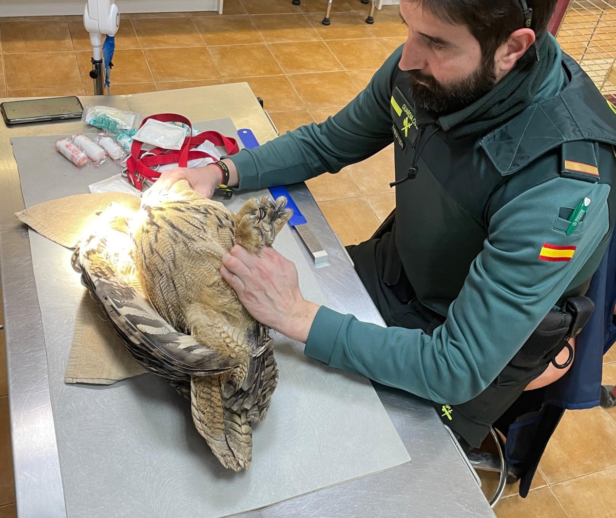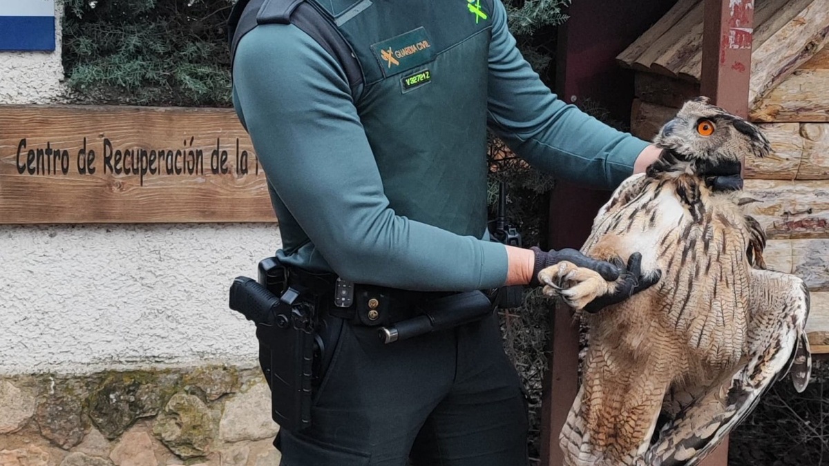 Gracias al aviso de varios vecinos, efectivos de la Guardia Civil de Chinchilla pudieron recoger a este ejemplar de búho real, que se encontraba herido e incapacitado para volar. Tras una primera valoración, los agentes procedieron a su traslado al Centro de Recuperación de Fauna Silvestre de Albacete, donde está siendo atendido por personal especializado.