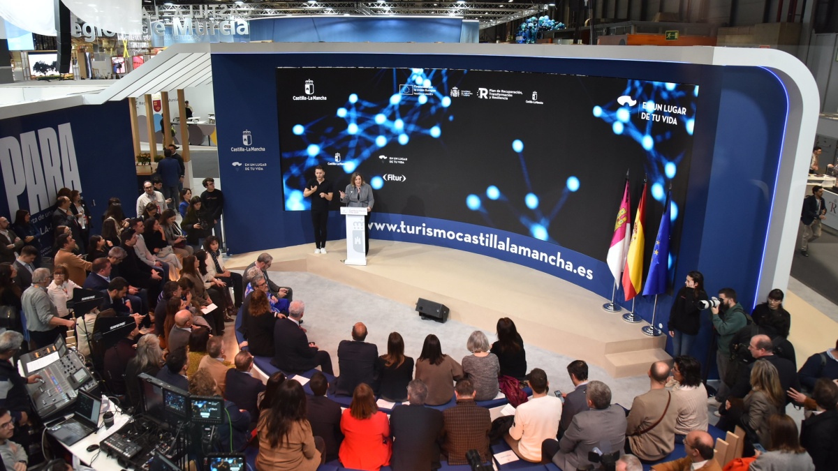 Patricia Franco ha presentado, en el escenario central del estand de Castilla-La Mancha en la 46 edición de FITUR, dos de las nuevas iniciativas de promoción y gestión del turismo en la región, relacionadas además de manera directa con el leitmotiv de la participación de este año de Castilla-La Mancha en la Feria Internacional de Turismo, a través de ese árbol central que preside el estand y que hace referencia a los nodos y nexos que las nuevas tecnologías tienden con el sector turístico.