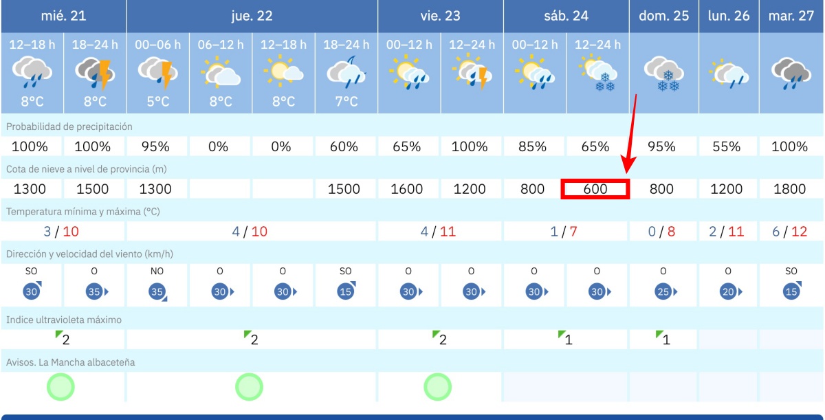 La previsión de AEMET para Albacete anticipa un empeoramiento a partir del viernes 23, con probabilidad de precipitación que sube del 65% (00–12 h) al 100% (12–24 h), y una cota de nieve que bajaría desde 1.600 a 1.200 metros a lo largo del día. Para el sábado, el descenso se acentúa hasta los 800 metros en la primera mitad y 600 metros en la segunda.