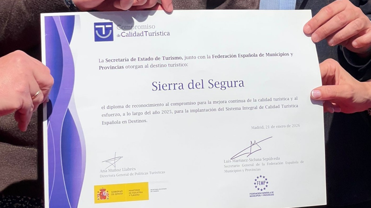 La Sierra del Segura ha vuelto a situarse en el mapa turístico nacional. Representantes del Grupo de Desarrollo Rural (GDR) Sierra del Segura recogieron ayer en la Feria Internacional de Turismo (FITUR) el reconocimiento como Destino SICTED Novel, una distinción integrada en el Sistema Integral de Calidad Turística Española en Destino (SICTED) que avala la apuesta de la comarca por un modelo turístico sostenible y de calidad.