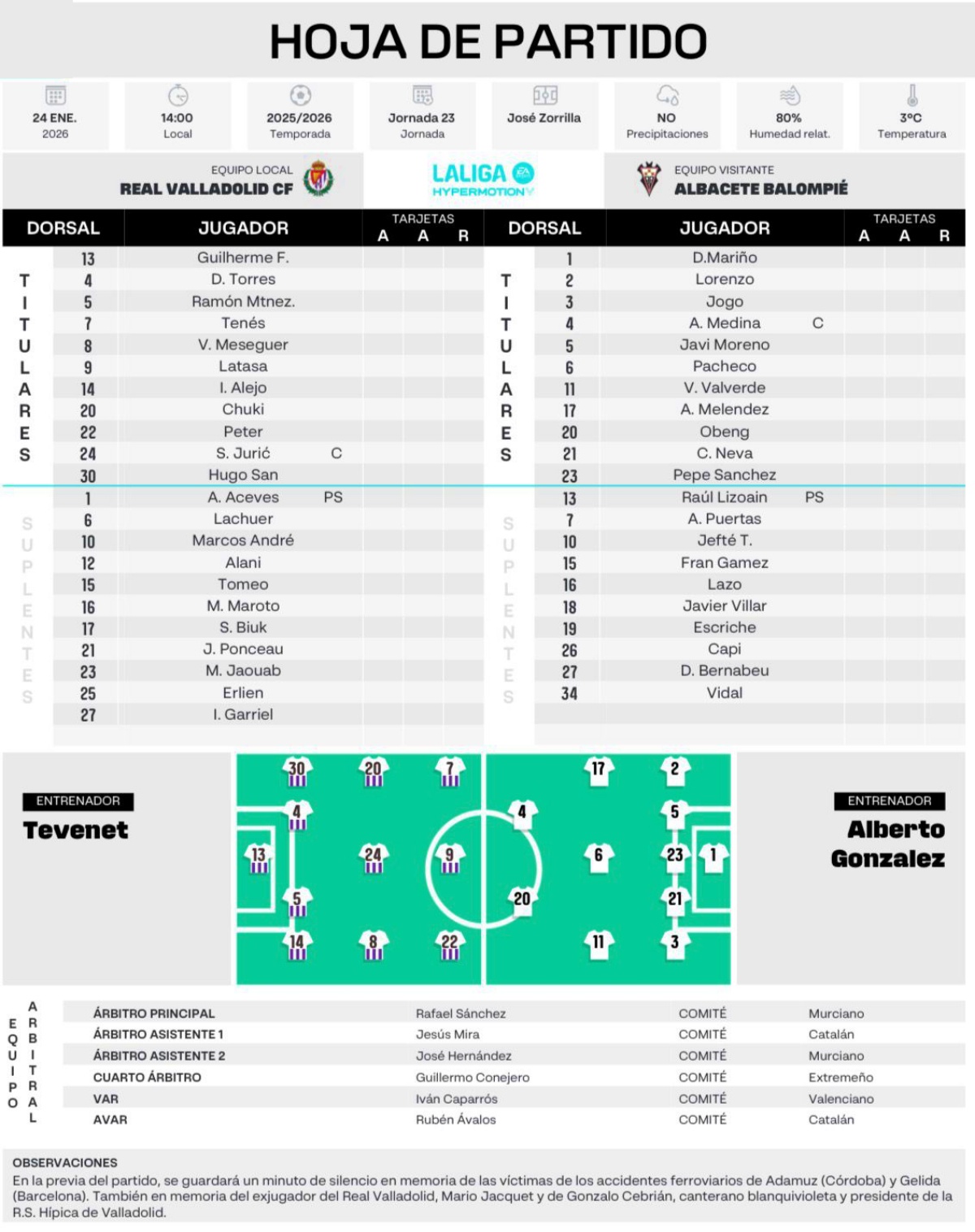 Consumidos los quince minutos de rigor los protagonistas regresaron al terreno de juego, y lo hicieron en idénticas combinaciones que cuando comenzó el partido, pues ni Tevenet ni Alberto aprovecharon la ventana del descanso para realizar cambio alguno y decidieron que Valladolid y Albacete comenzaran la reanudación con los mismos mimbres.