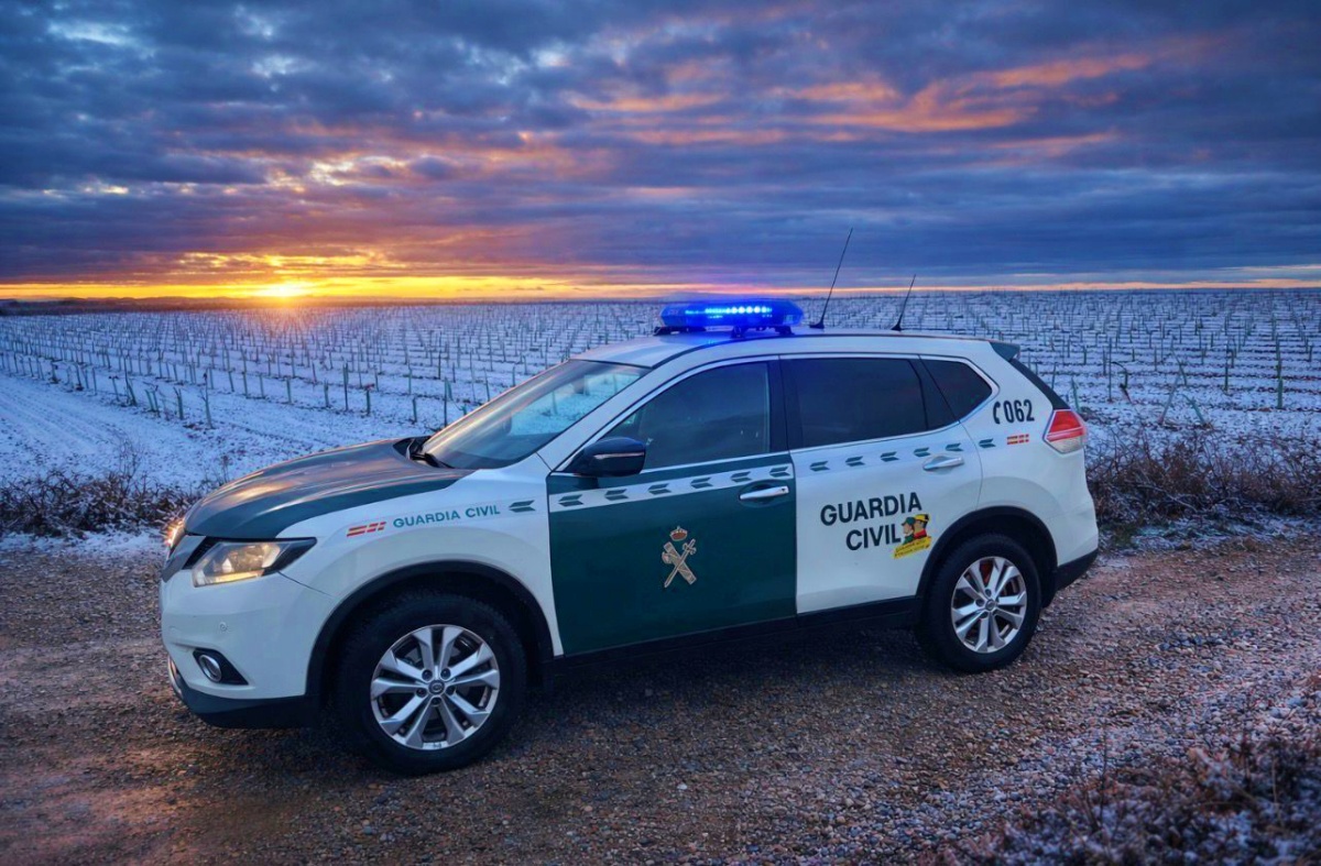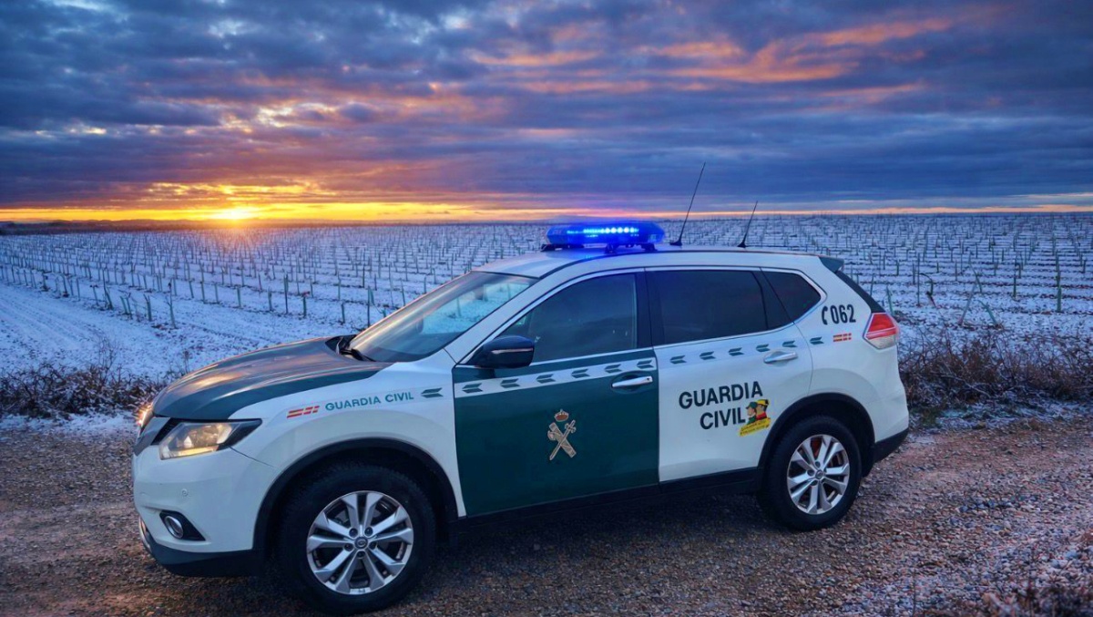 La escena, compartida por la Guardia Civil de Albacete en redes sociales, muestra un paisaje rural de invierno: hileras de cepas desnudas, caminos terrosos aún fríos y un manto helado que suaviza los contornos del campo. En primer plano, un vehículo oficial permanece detenido junto a la vía, con el puente de luces encendido, como si el destello azul escoltara el nacimiento del día en medio del silencio del amanecer.