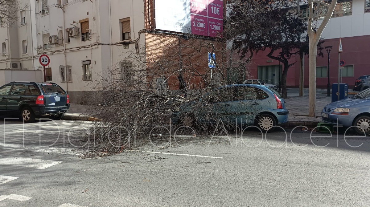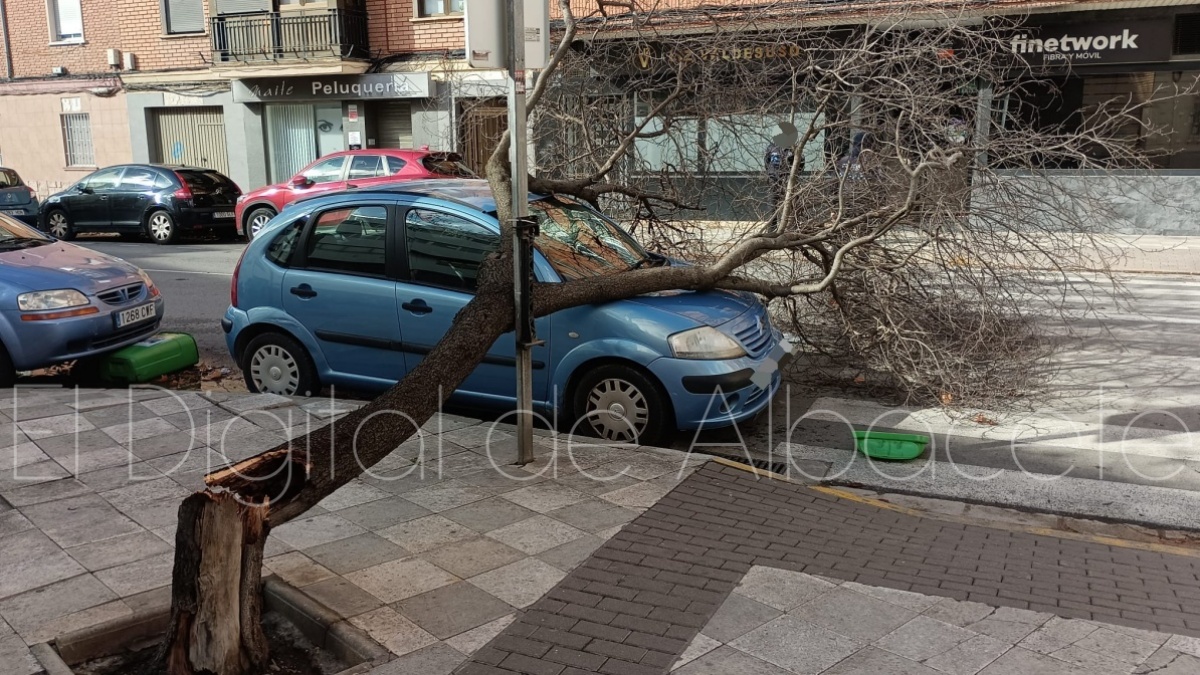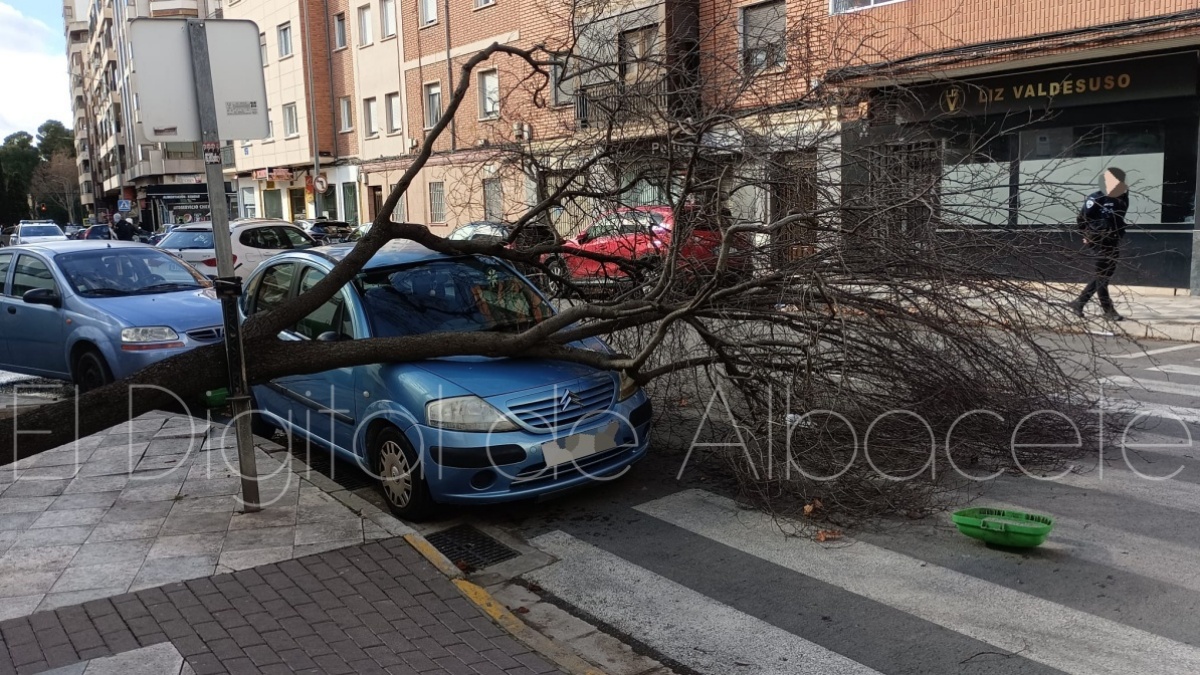 Uno de los episodios destacados ha tenido lugar sobre las 14:00 horas de este miércoles, 28 de enero, cuando un árbol, situado entre la calle Batalla del Salado y la calle Alarcón, ubicadas en las inmediaciones de la Avenida de España, ha caído sobre un coche a causa del fuerte viento que registra la capital albaceteña en esta jornada.