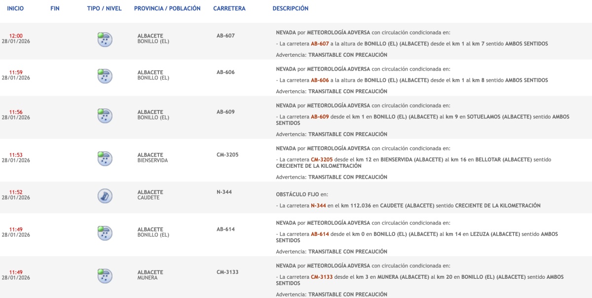 A la hora de redactar esta información se encuentran seis carreteras afectadas por nevadas a lo largo y ancho de la provincia de Albacete, así como por la meteorología adversa que condiciona la circulación en diferentes puntos.