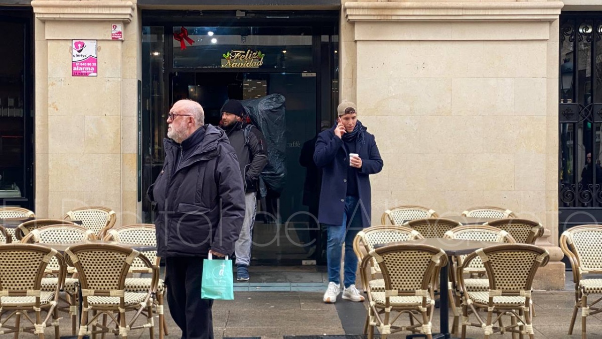 Durante la mañana, el equipo ha hecho una pausa en la grabación para descansar y tomar un café en un establecimiento situado en la propia Calle Ancha. En ese momento, se ha podido ver a Xuso Jones en la puerta del local, con un café para llevar en la mano, hablando por teléfono antes de continuar con el rodaje.