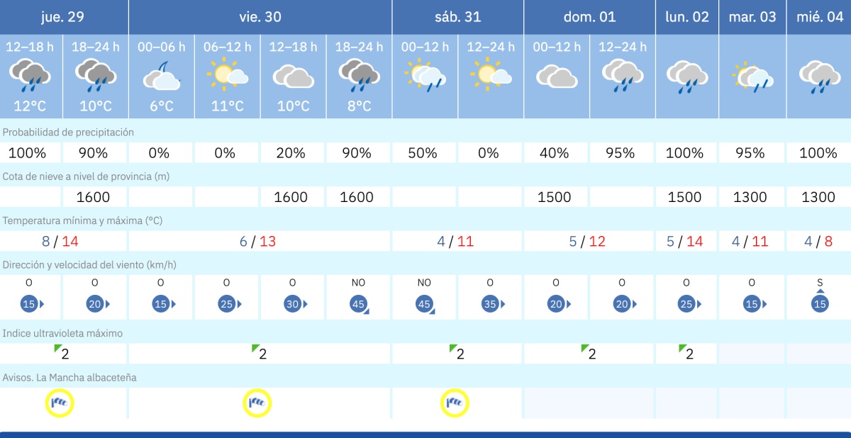 La pausa de esta mañana, sin embargo, no debe interpretarse como un final definitivo. La propia previsión de la AEMET para Albacete capital apunta a que el respiro es parcial y que la inestabilidad seguirá marcando el guion de los próximos días.