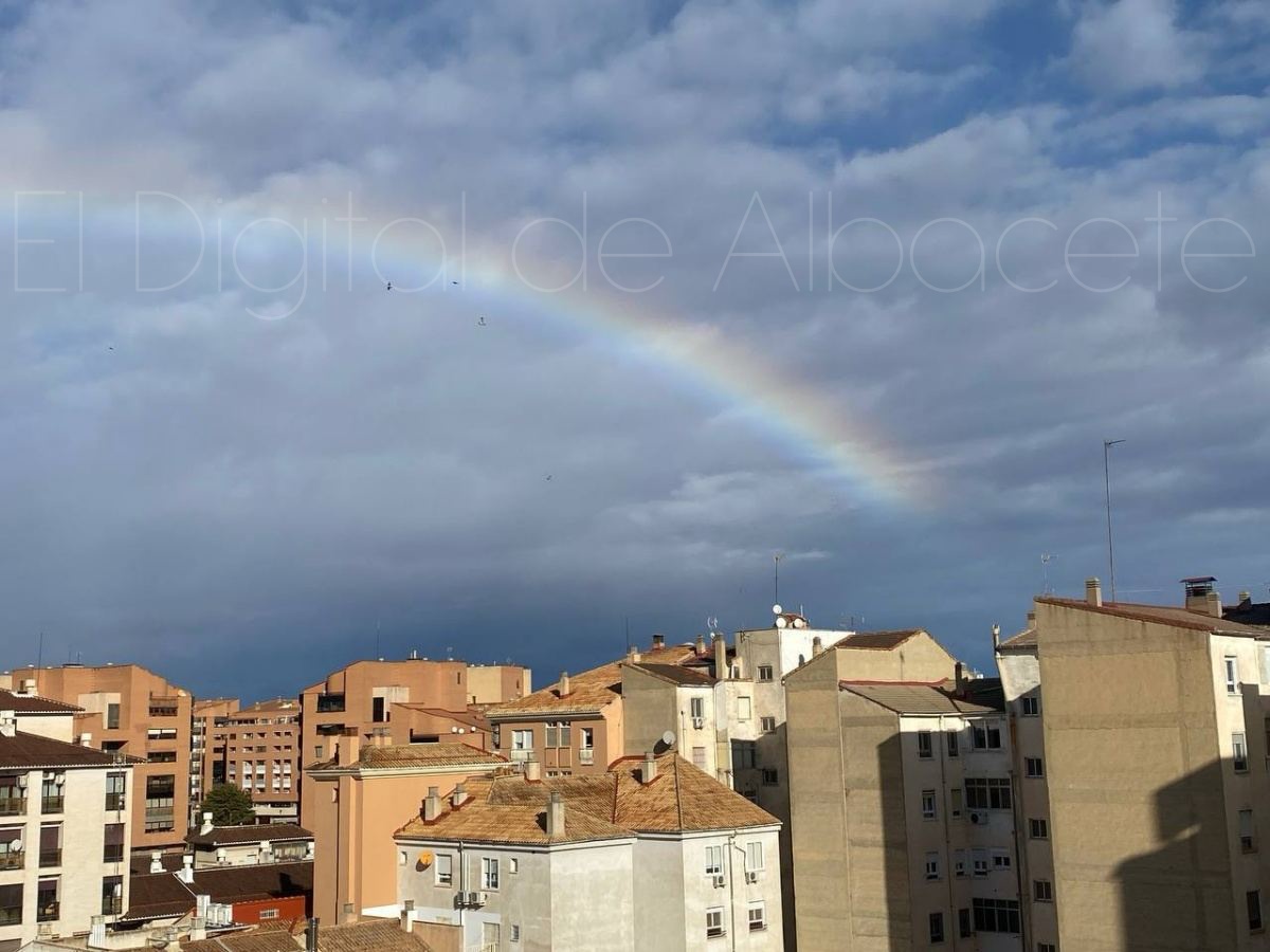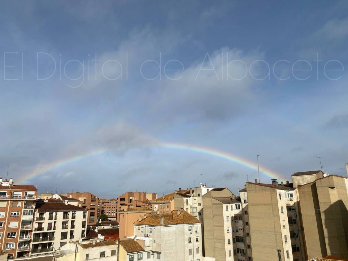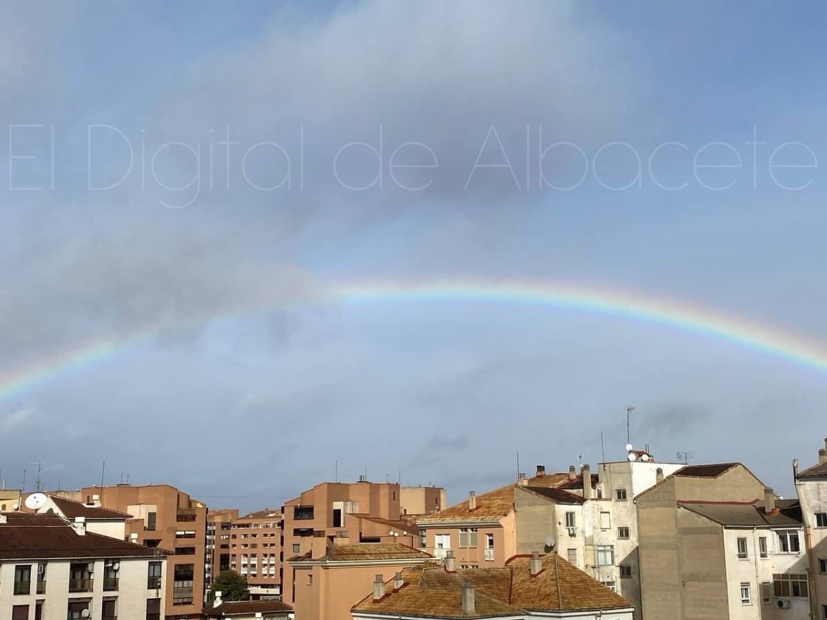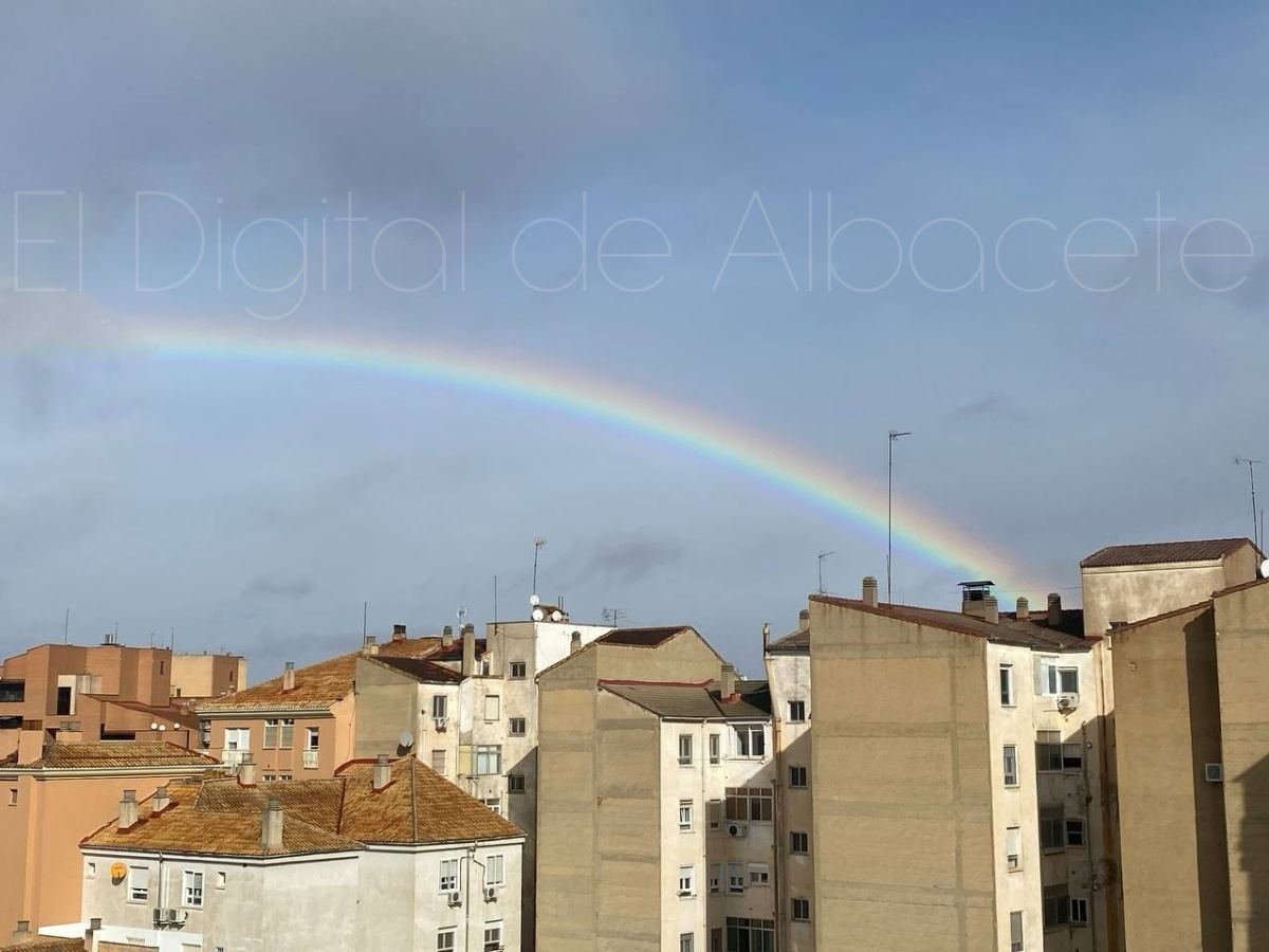 La ciudad de Albacete amaneció hoy con una tregua breve, casi íntima, de esas que no se anuncian con trompetas pero se sienten en la piel. Tras el miércoles áspero y dañino que dejó a su paso la borrasca Kristin, la naturaleza pareció bajar el tono esta mañana para regalar a los vecinos de la capital una imagen de reconciliación: un arcoíris amplio, nítido, tendido sobre los tejados como una costura de color remendando el cielo gris.