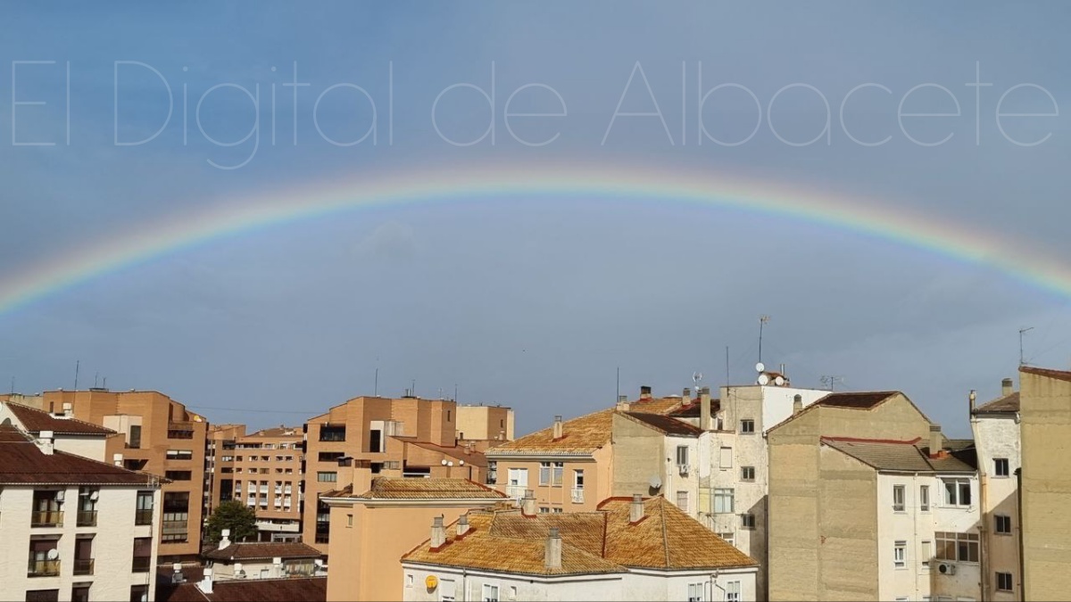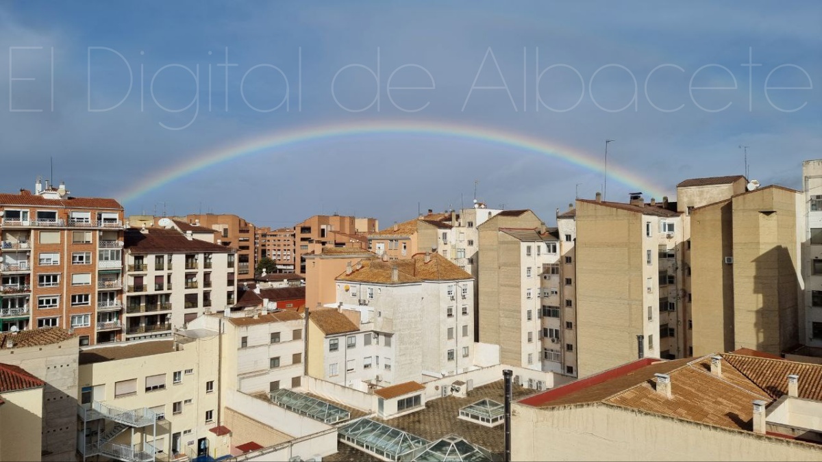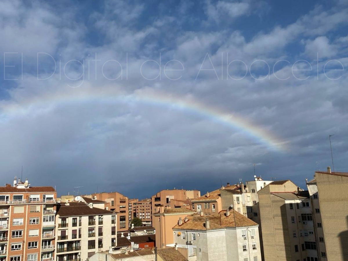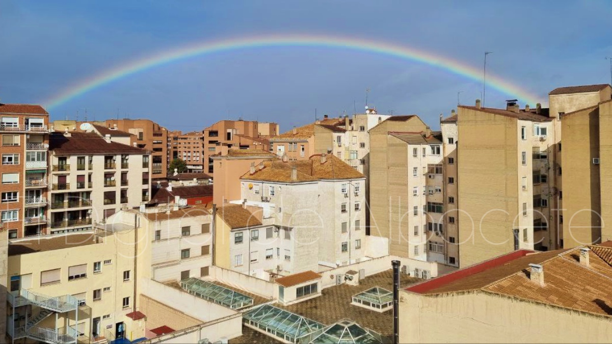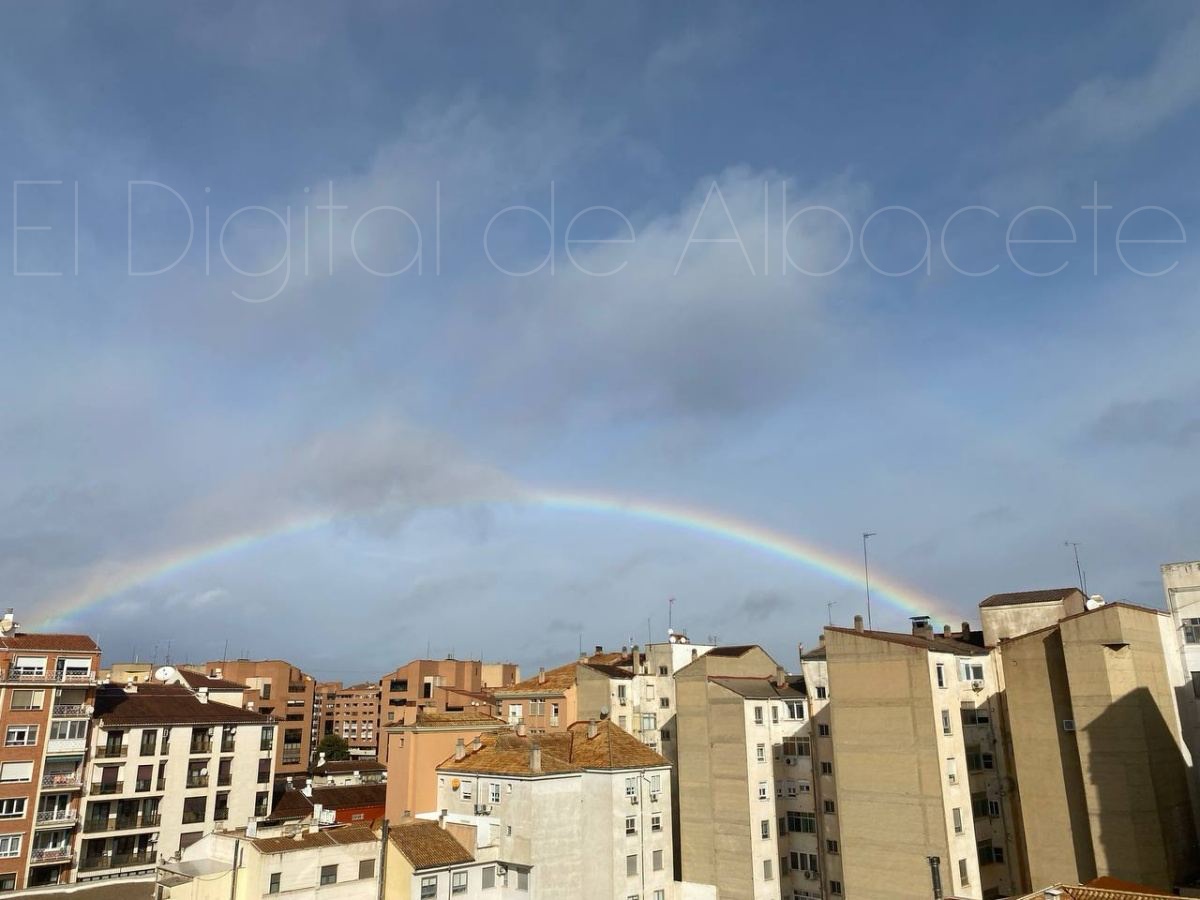 La ciudad de Albacete amaneció hoy con una tregua breve, casi íntima, de esas que no se anuncian con trompetas pero se sienten en la piel. Tras el miércoles áspero y dañino que dejó a su paso la borrasca Kristin, la naturaleza pareció bajar el tono esta mañana para regalar a los vecinos de la capital una imagen de reconciliación: un arcoíris amplio, nítido, tendido sobre los tejados como una costura de color remendando el cielo gris.