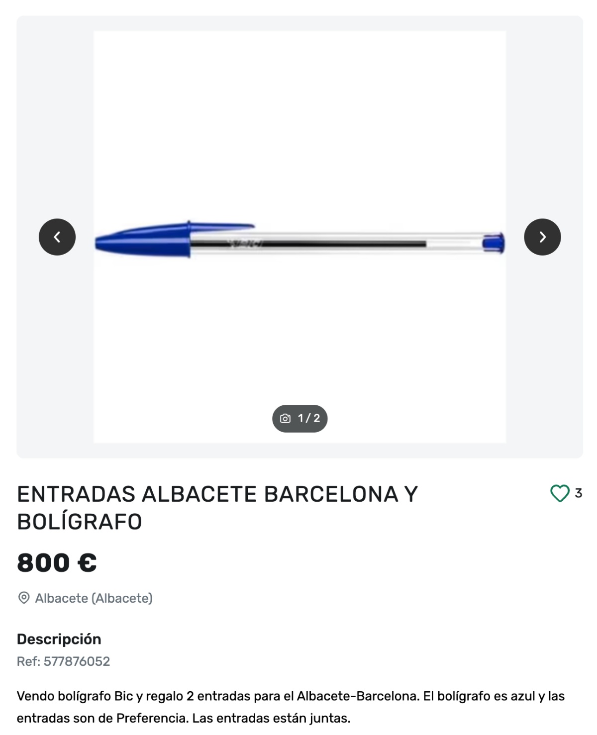Uno de los anuncios más llamativos localizados en Milanuncios ofrece dos entradas por 800 euros, bajo el ya habitual «vendo bolígrafo Bic y regalo dos entradas para el Albacete-Barcelona. El bolígrafo es azul y las entradas son de Preferencia y están juntas».