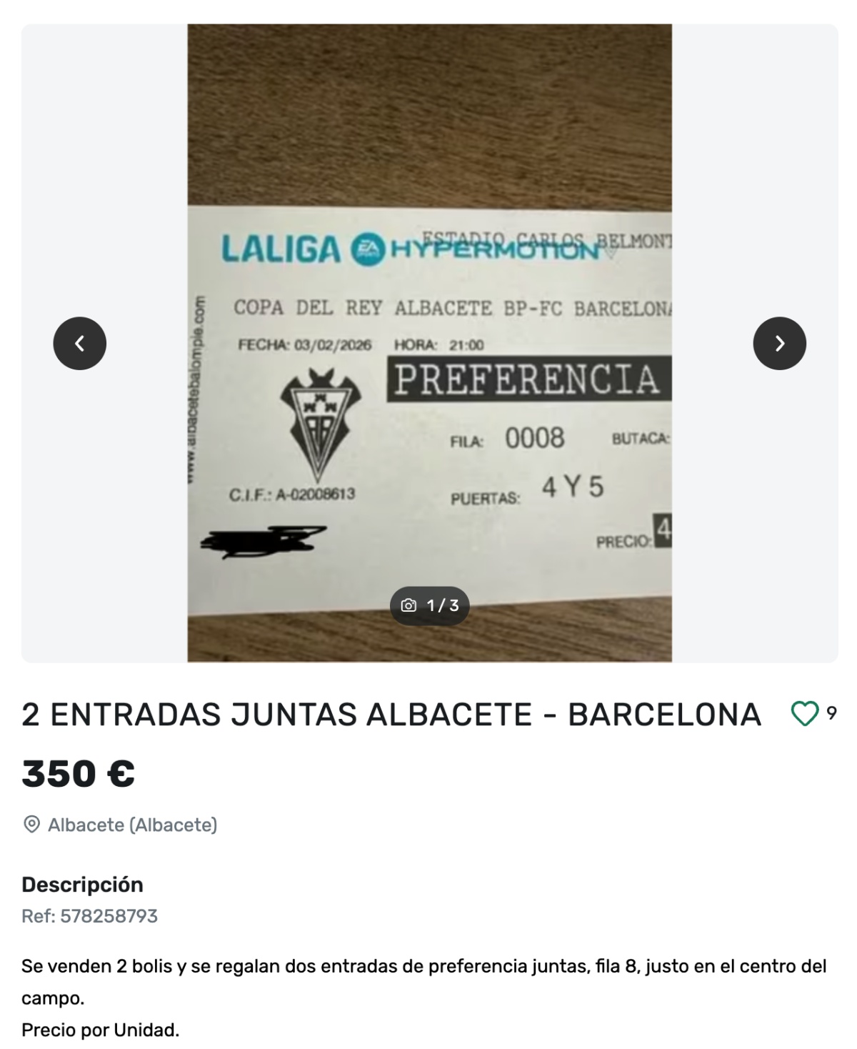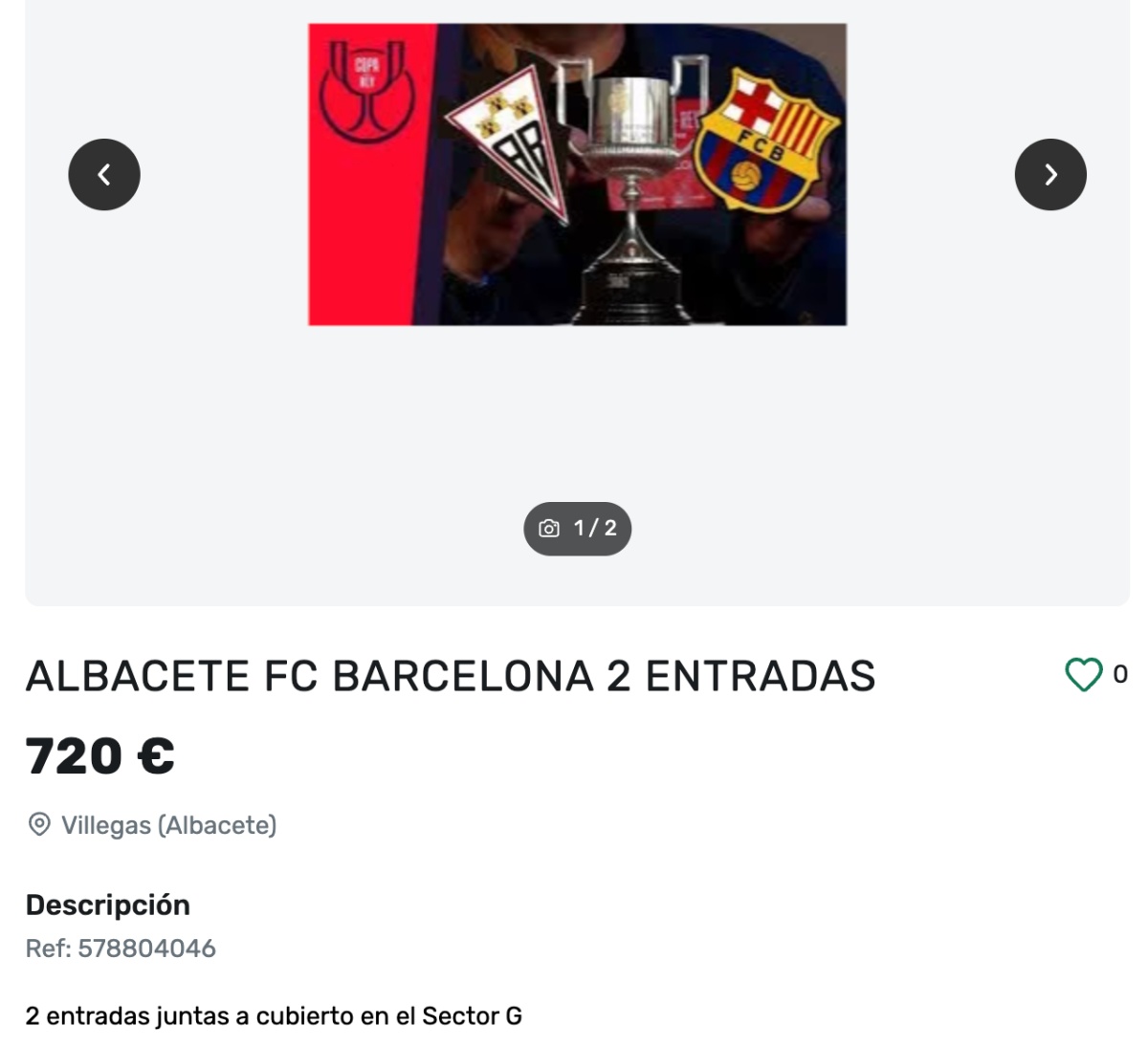 En los últimos días han comenzado a proliferar anuncios en plataformas de compraventa como Milanuncios en los que se ofertan entradas para el Albacete-Barça por cantidades que multiplican varias veces su precio oficial. En muchos casos, además, los vendedores recurren a fórmulas ya conocidas para tratar de eludir responsabilidades, camuflando la operación bajo la supuesta venta de objetos sin valor real.