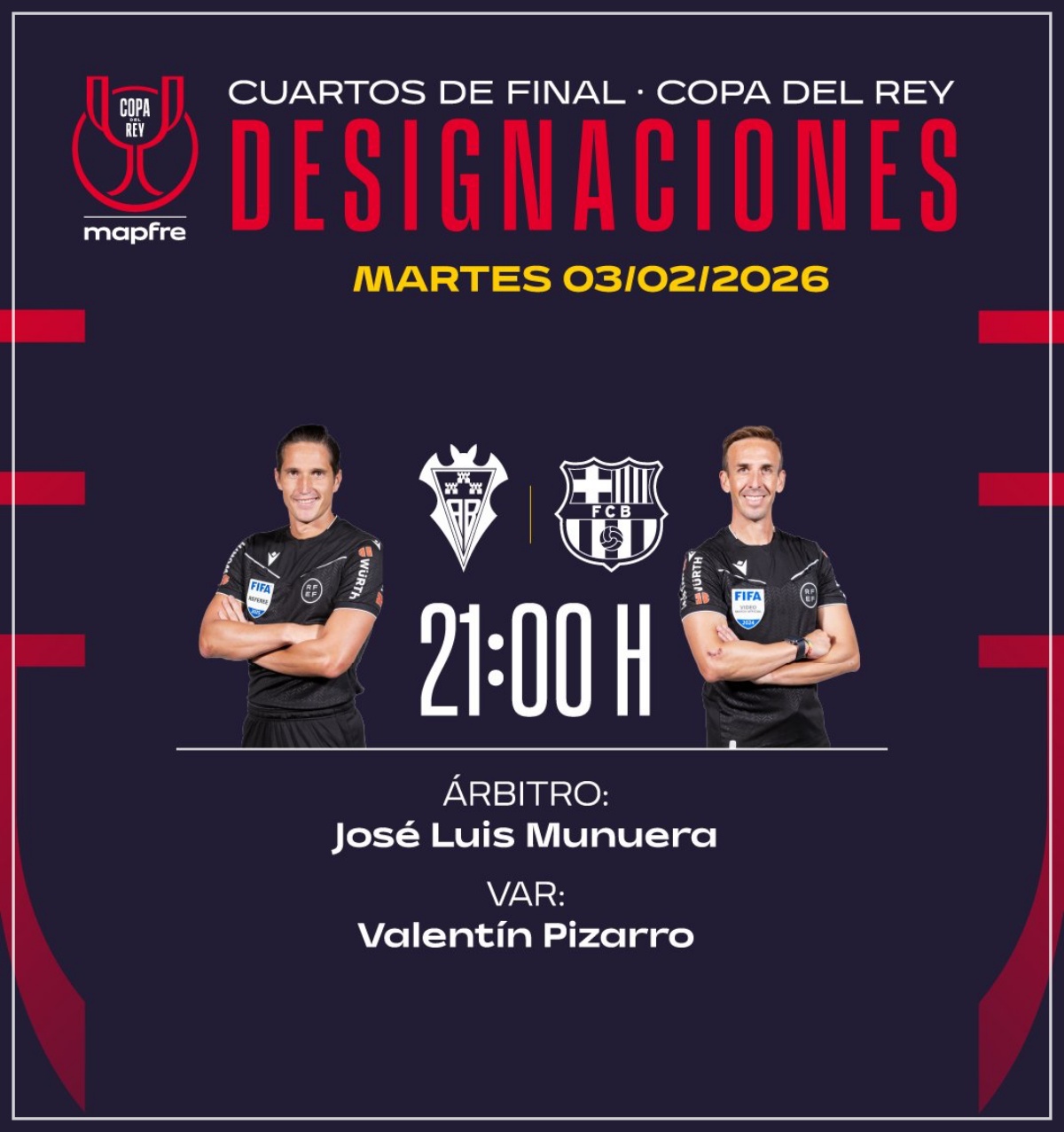 Así las cosas, el encargado de impartir justicia será el colegiado del Comité Andaluz José Luis Munuera Montero dirigirá este martes el partido de cuartos de final de la Copa del Rey entre Albacete y Barcelona, a las 21.00 horas en el estadio Carlos Belmonte, donde Valentín Pizarro Gómez (C. Madrileño) actuará como VAR.