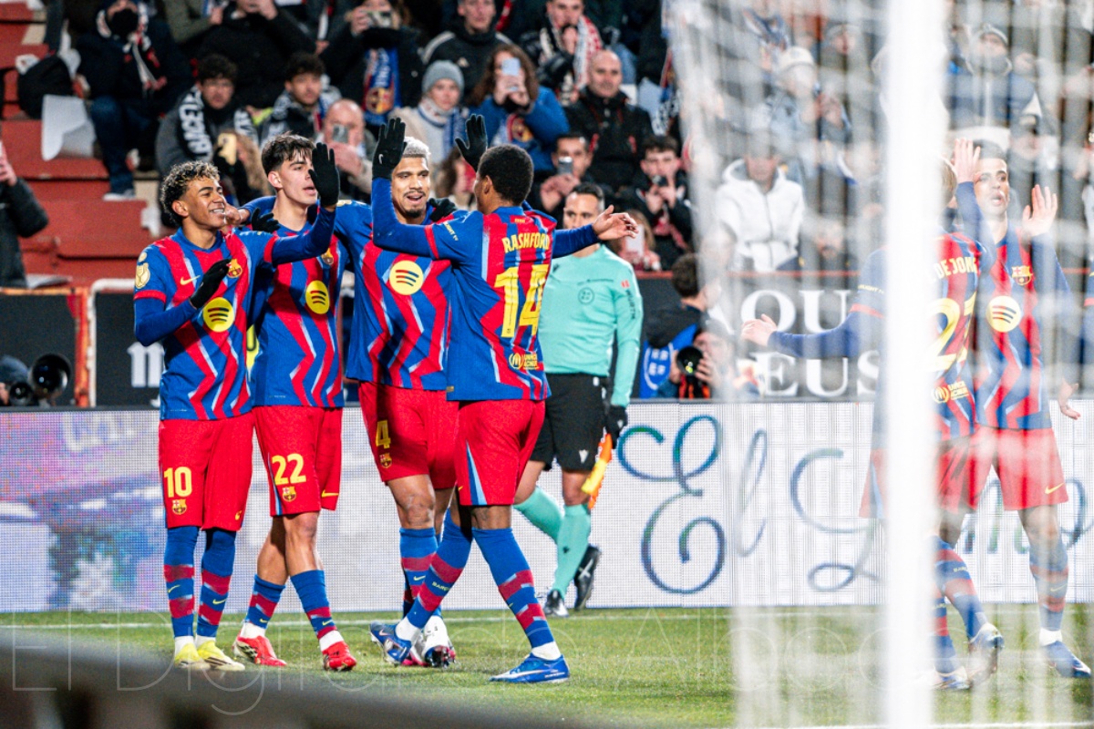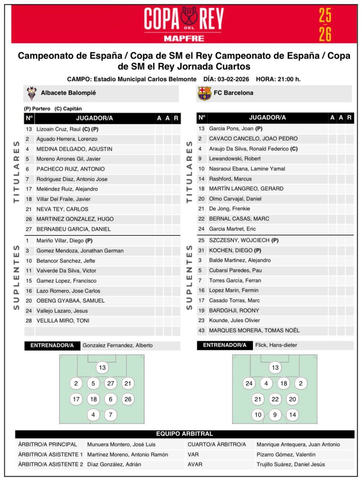 Por su parte, el FC Barcelona presenta un once de garantías pese a algunas ausencias por lesión y gestión de cargas de competición. Arranca con Joan García bajo los palos; línea defensiva compuesta por João Cancelo, Gerard Martín, Ronald Araujo y Éric García; en el medio Marc Bernal, Frenkie de Jong y Dani Olmo; y arriba el tridente formado por Lamine Yamal, Robert Lewandowski y Marcus Rashford. En la grada técnica, preparados para entrar, aguardaban Balde, Cubarsí, Ferran, Fermín, M. Casadó, Roony, Kounde, Szczesny, Kochen y Tommy.