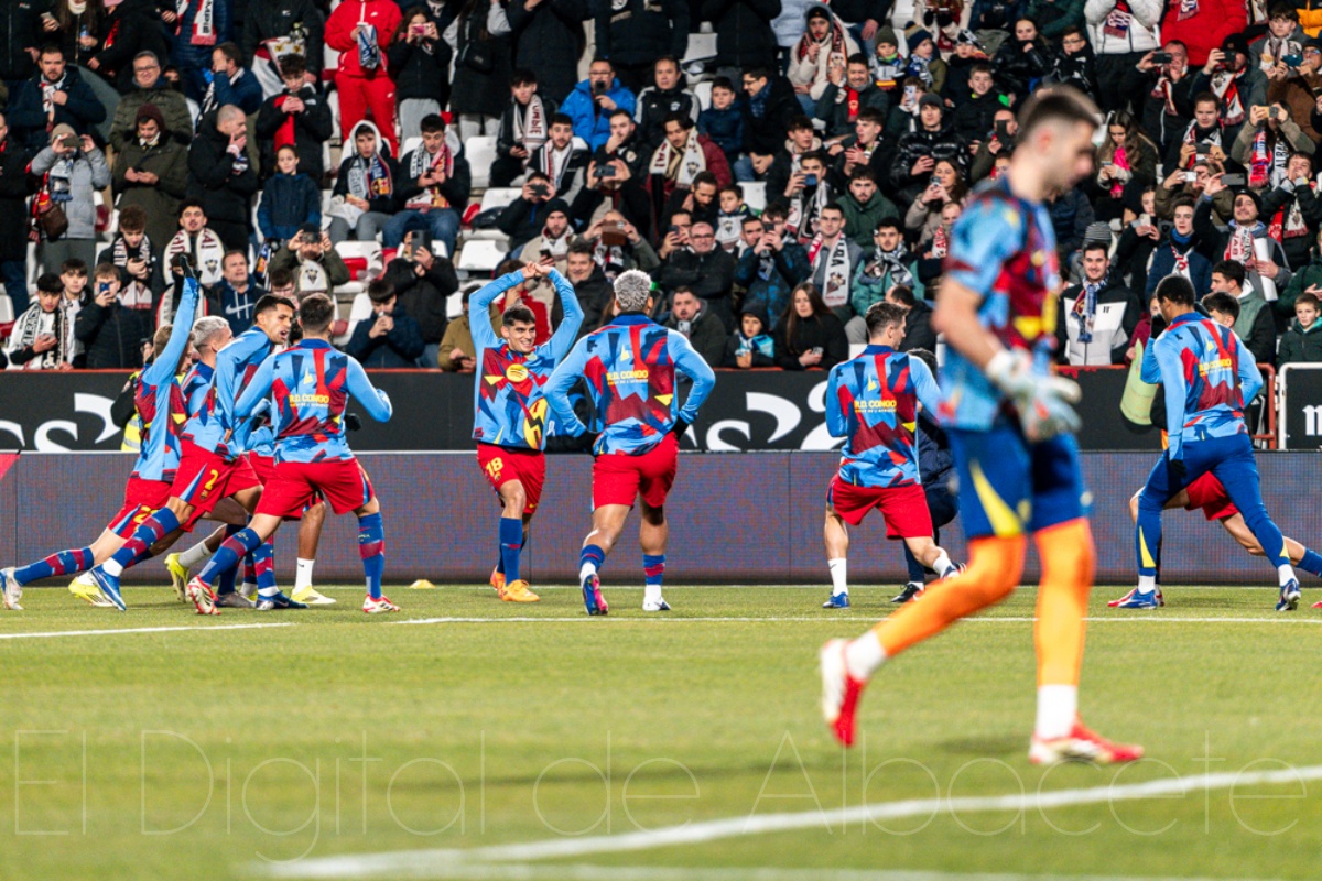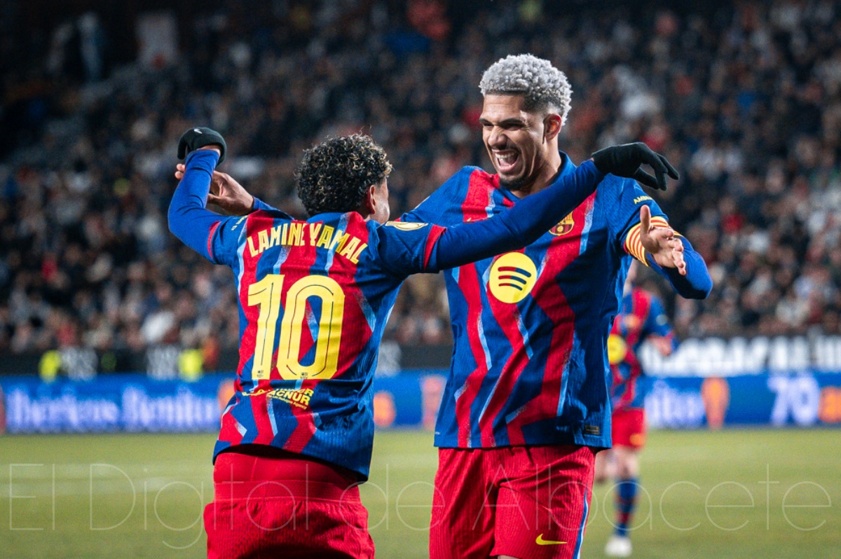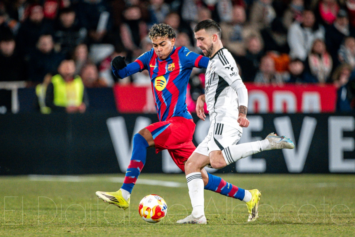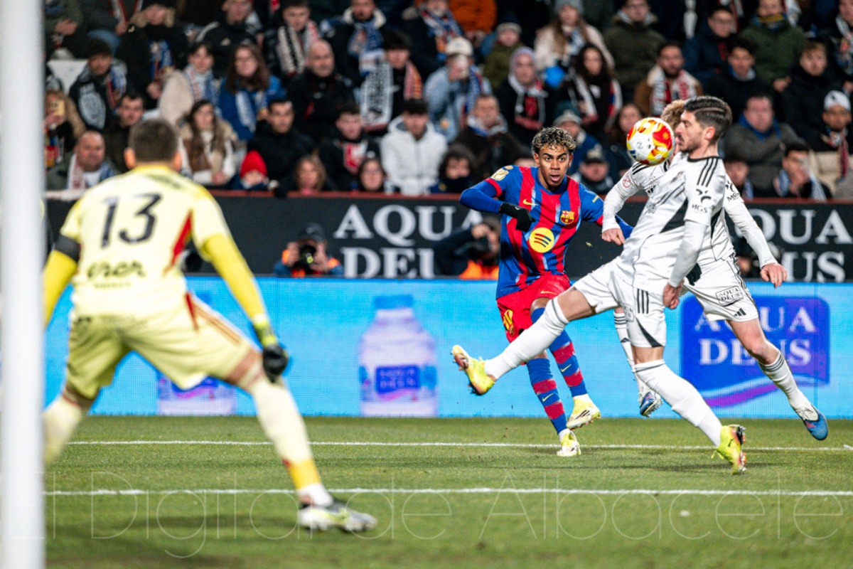 Estaba el Albacete cómodo y el partido enfilaba la recta final de la primera mitad, pero la presión del Barcelona en la salida de balón tuvo premio cuando Rashford le robó el balón a Lorenzo Aguado y abrió para De Jong, quien ensanchó el campo aún más buscando por la derecha a un Lamine Yamal que con espacios no perdonó y alojó el balón lejos de los dominios de Raúl Lizoain y donde le dio la gana, marcando un buen gol y adelantando al Barcelona en el electrónico. El Barcelona daba un zarpazo letal tras aprovechar un fallo en la salid de balón del Albacete. Corría el minuto 39.