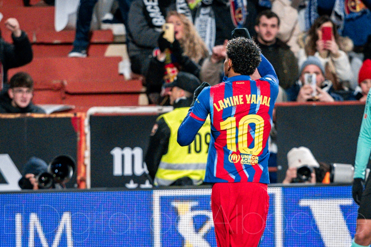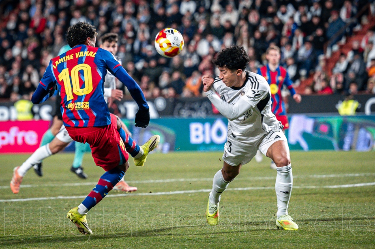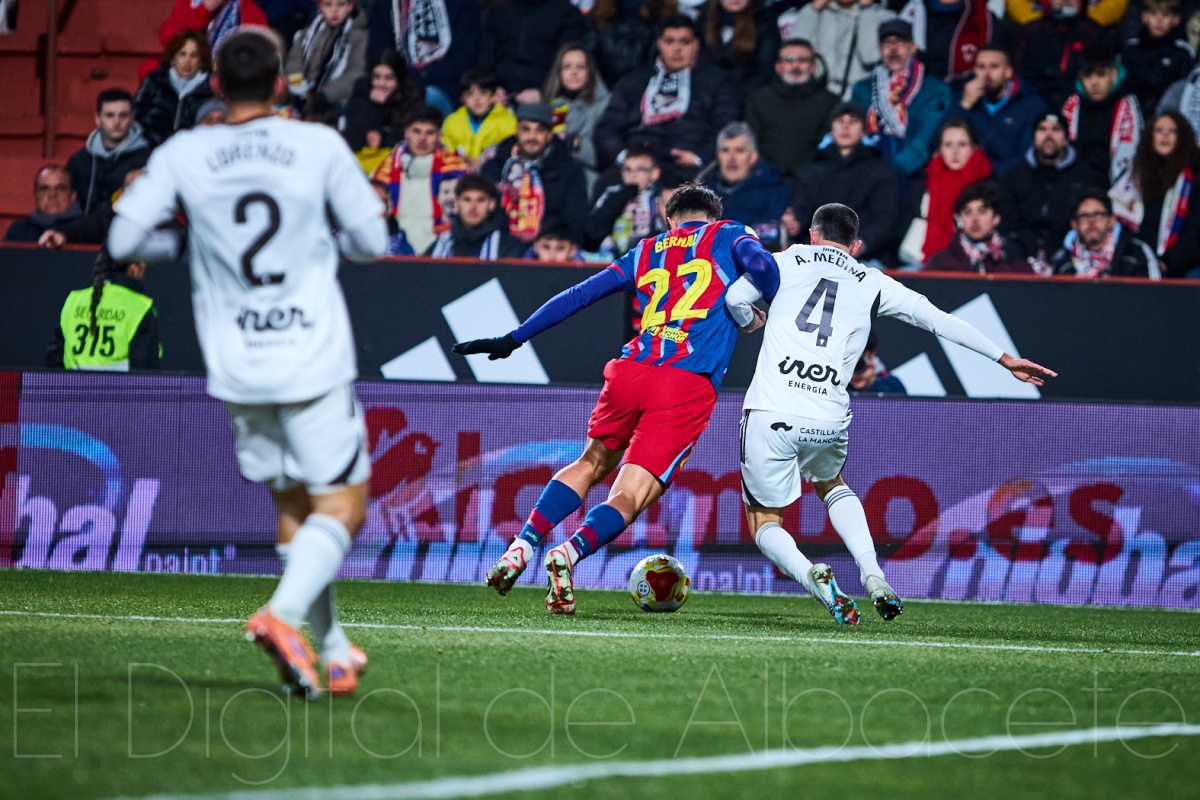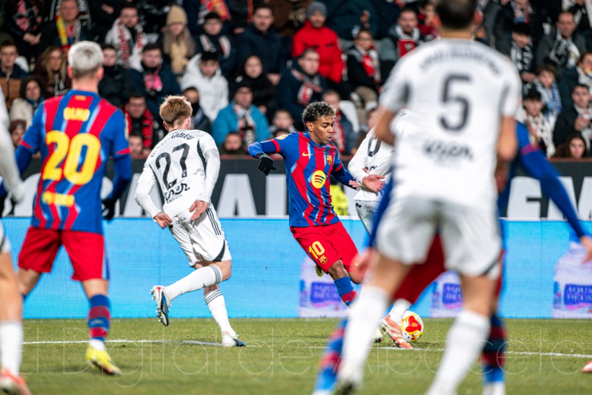 Estaba el Albacete cómodo y el partido enfilaba la recta final de la primera mitad, pero la presión del Barcelona en la salida de balón tuvo premio cuando Rashford le robó el balón a Lorenzo Aguado y abrió para De Jong, quien ensanchó el campo aún más buscando por la derecha a un Lamine Yamal que con espacios no perdonó y alojó el balón lejos de los dominios de Raúl Lizoain y donde le dio la gana, marcando un buen gol y adelantando al Barcelona en el electrónico. El Barcelona daba un zarpazo letal tras aprovechar un fallo en la salid de balón del Albacete. Corría el minuto 39.