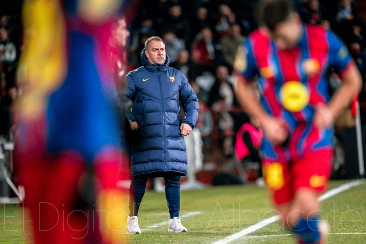 Tras el intento de comienzo fulgurante del Barcelona y la réplica del Albacete, las aguas se calmaron en el coliseo blanco y el partido entró en una fase en la que el cuadro azulgrana era el que dominaba, pero el Alba lo frenaba a muchos metros de su área y Lizoain vivía tranquilo bajo palos. Al Barça le estaba costando mucho romper las líneas dispuestas por el Albacete y los de Flick se mostraban atascados e incapaces de superar el entramado dispuesto por Alberto González y ejecutado a la perfección por sus pupilos.