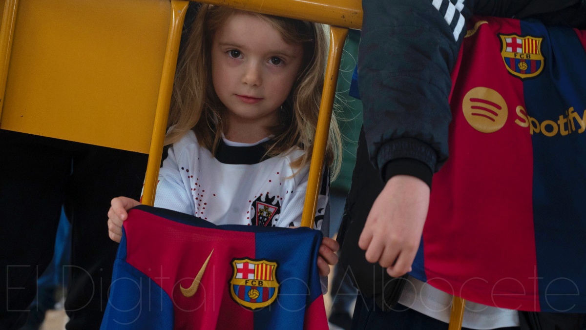 En la antesala del partido de esta noche en el Carlos Belmonte, la escena que mejor explica lo que flota en el ambiente no se mide en estadísticas ni en presupuestos. Se mide en una mirada. La de una niña, esta mañana, tras una valla amarilla en el Aeropuerto de Albacete: vestida con la camiseta del Alba, sosteniendo entre las manos una del Barcelona, con esa dulzura que desarma… y con un gesto que advierte. Como si el fútbol, de pronto, recordara su propia moraleja: no subestimes al que parece pequeño.