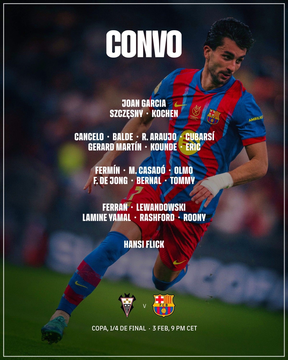 El FC Barcelona ya tiene lista su expedición para el duelo de esta noche en el Estadio Carlos Belmonte, donde se medirá al Albacete Balompié en los cuartos de final de la Copa del Rey (21.00 h, partido único). El técnico azulgrana, Hansi Flick, ha citado a tres porteros, siete defensas, seis centrocampistas y cuatro atacantes en una convocatoria marcada por las ausencias por problemas físicos y por la exigencia de una eliminatoria sin margen de error.