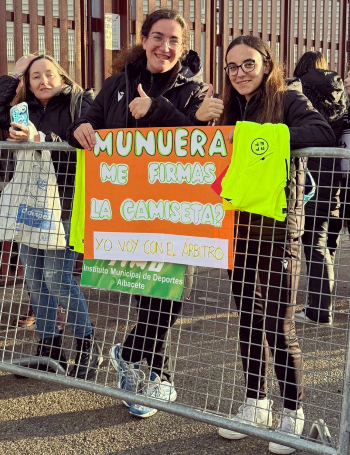 Así, mientras los aficionados llegaban para animar al Albacete Balompié y recibir a los jugadores del Barça, estas chicas con su pancarta eran la excepción. Ellas lo tenían claro, iban con el árbitro. Un gesto espontáneo y poco común que se salió de la norma y convirtió una espera helada en una anécdota distinta, simpática y muy poco vista en un estadio de fútbol.