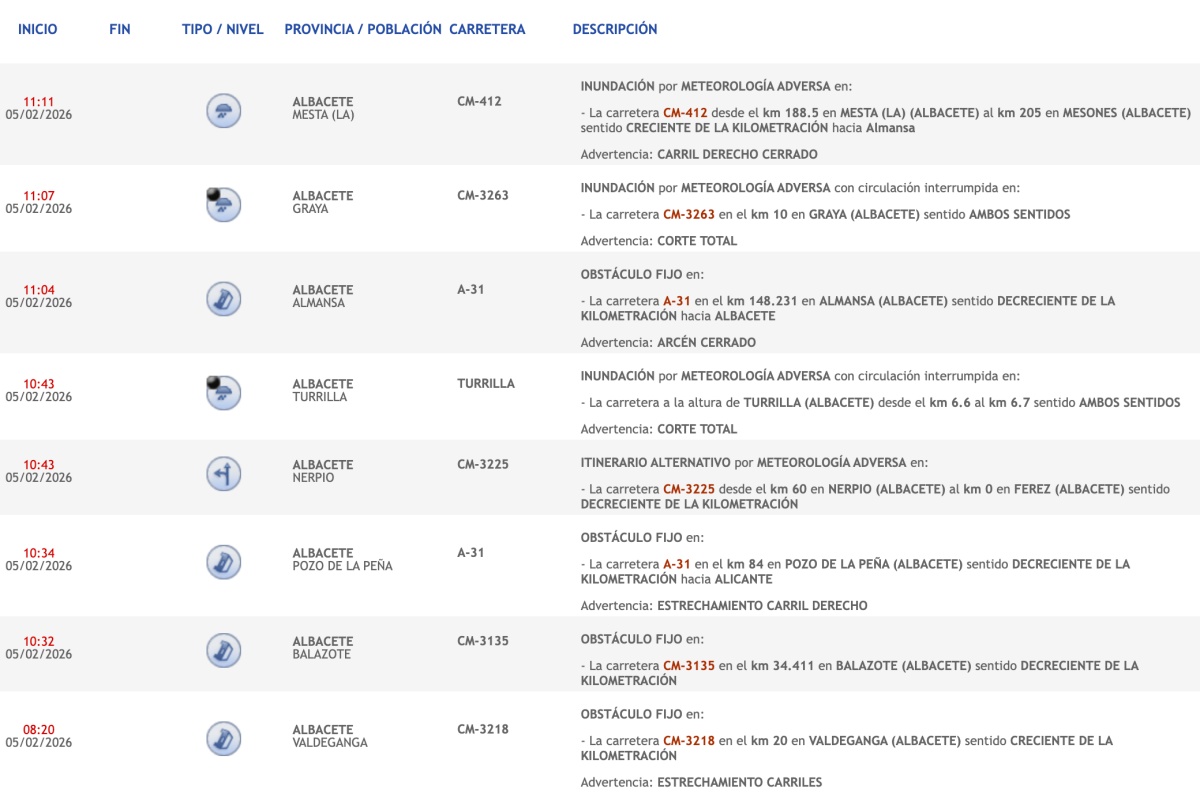A la hora de redactar esta información, tanto la CM-412 a la altura de Mesta, como la CM-3263 han interrumpido su circulación por inundaciones provocadas por la borrasca que atraviesa la provincia de Albacete, según indica la DGT. Además, hay otras carreteras afectadas como la CM-3225 en Nerpio, la A-31 en Pozo de la Peña, la CM-3135 a la altura de Balazote, y la CM-3218 en Valdeganga.