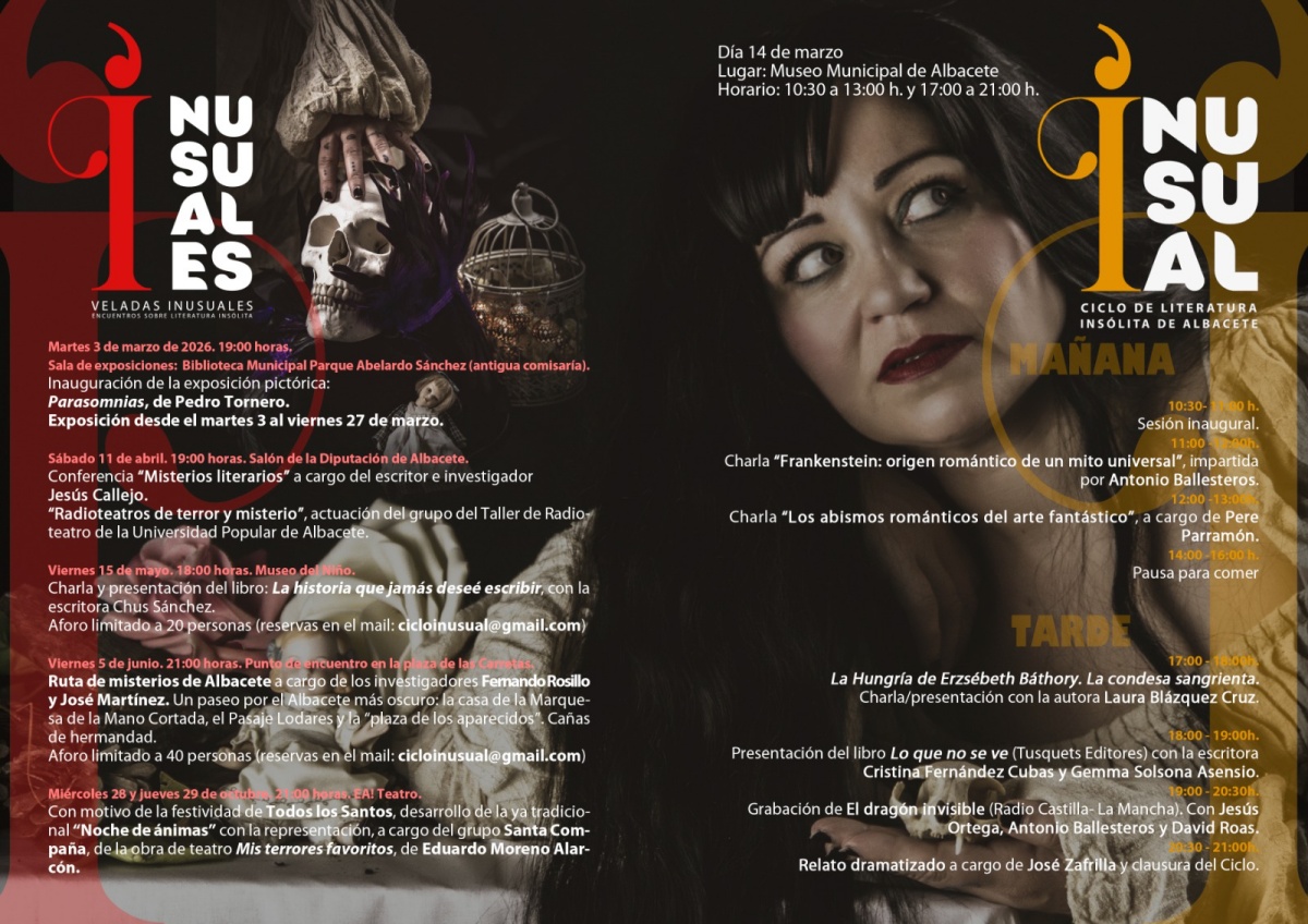 Por su parte, el ‘Ciclo Inusual de Literatura Insólita de Albacete’, que ha avanzado la concejala de Cultura de Albacete, ha sido detallado por el director, y se celebrará el sábado 14 de marzo en el Museo Municipal y contará con una completa jornada dedicada al género insólito. A lo largo del día se sucederán charlas y actividades como la conferencia ‘Frankenstein: origen romántico de un mito universal’, a cargo de Antonio Ballesteros; ‘Los abismos románticos del arte fantástico’, impartida por Pepe Parramón; ‘La Hungría de Erzsébet Báthory. La condesa sangrienta’, por Laura Blázquez Cruz; y la presentación del libro ‘Lo que no se ve’, de Cristina Fernández y Gemma Solsoma. Iniciativas a las que se sumará la grabación del programa radiofónico ‘El dragón invisible’ de Radio C-LM, con Jesús Ortega, Antonio Ballesteros y David Roas; y un relato dramatizado a cargo de José Zafrilla.