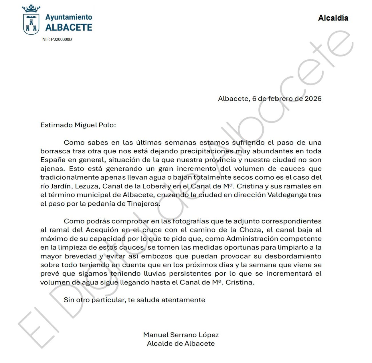 En el primero de esos escritos, al que ha tenido acceso El Digital de Albacete, Serrano recuerda que el aumento de agua afecta a “cauces que tradicionalmente apenas llevan agua o bajan totalmente secos”, citando expresamente el “río Jardín, Lezuza, Canal de la Lobera y en el Canal de Mª. Cristina y sus ramales”, y pide que, “como Administración competente en la limpieza de estos cauces, se tomen las medidas oportunas para limpiarlo a la mayor brevedad y evitar así embozos que puedan provocar su desbordamiento”.