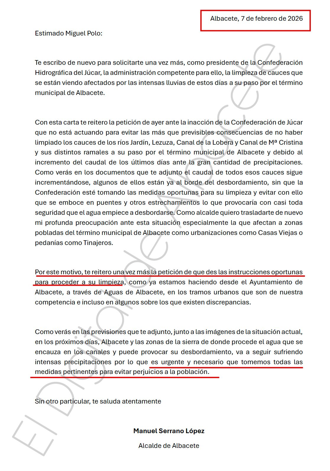 El Ayuntamiento de Albacete llevaba días reclamando por escrito a la Confederación Hidrográfica del Júcar (CHJ) actuaciones urgentes de limpieza y gestión del caudal en los cauces que atraviesan el término municipal. En dos cartas consecutivas, fechadas el 6 y el 7 de febrero, el alcalde, Manuel Serrano, trasladó al presidente del organismo, Miguel Polo, su preocupación por el incremento de caudales tras “el paso de una borrasca tras otra”, con canales y ramales “al máximo de su capacidad” en algunos tramos. Este mismo lunes, y ante el caso omiso del organismo dependiente del Gobierno de España a los requerimientos del Ayuntamiento de Albacete, el propio consistorio ha remitido un informe implorando una solución urgente ante la situación límite de la red de evacuación acompañado de un mapa con las zonas que potencialmente podrían sufrir inundaciones si no se actuaba, como así ha sido.