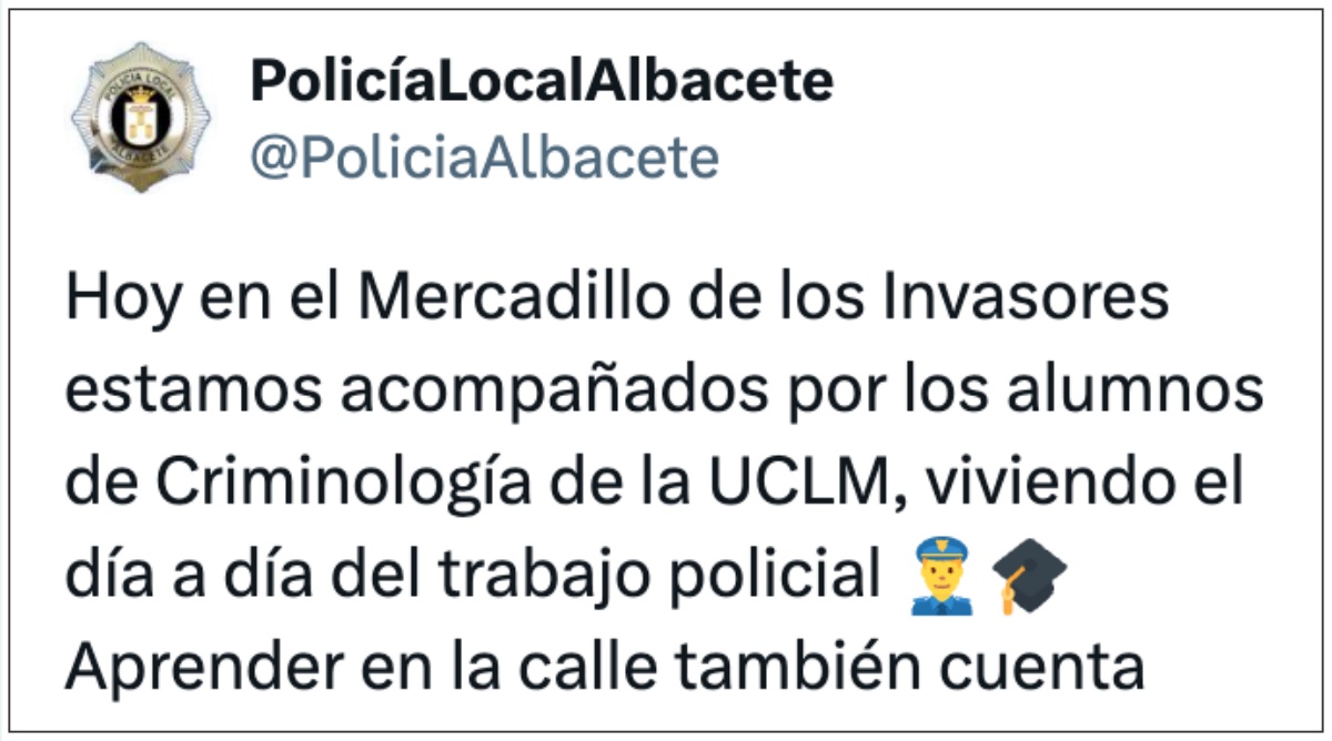 La presencia del alumnado se enmarca en la colaboración habitual entre instituciones para acercar la formación universitaria a contextos reales de servicio público. En este caso, el mercadillo —uno de los espacios más concurridos de la ciudad los martes— ofrece un escenario especialmente útil para observar procedimientos cotidianos de vigilancia, prevención, atención a la ciudadanía y coordinación operativa. La propia Policía Local de Albacete ha compartido la actividad a través de sus redes sociales, subrayando el valor pedagógico de la experiencia: “Hoy en el Mercadillo de los Invasores estamos acompañados por los alumnos de Criminología de la UCLM, viviendo el día a día del trabajo policial. Aprender en la calle también cuenta”.