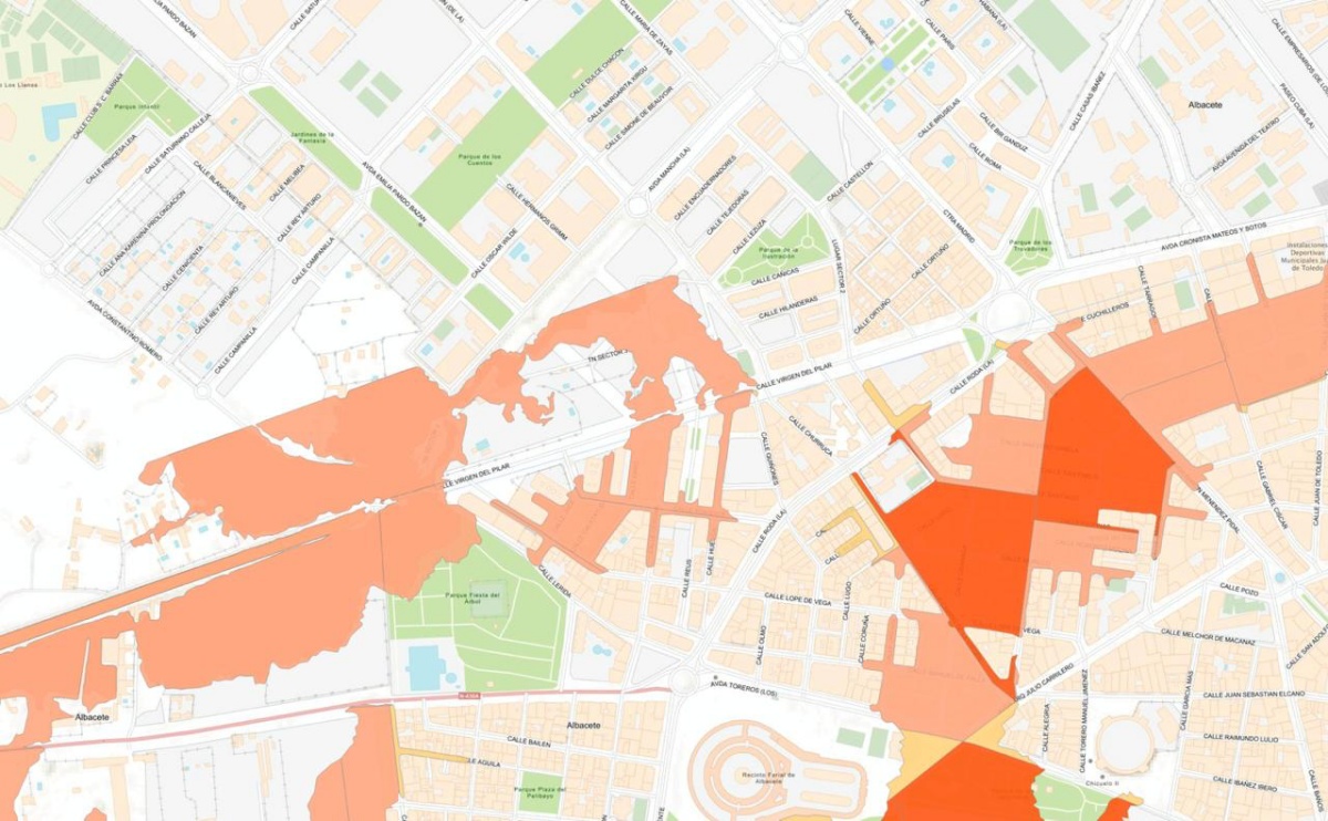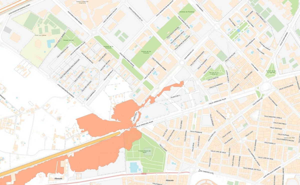 De este modo, se desprende del mapa de riesgo a la población por inundaciones de origen fluvial a 100 años, elaborado por el SNCZI, que el agua afectaría a varias zonas del Sector 3 de Albacete. En concreto, llegaría incluso a las zonas de previsión de bloques de viviendas según las infografías publicadas en su día por el propio Ayuntamiento de Albacete, colándose tanto en la zona destinada a zonas verdes como en las marcadas para la construcción de los propios edificios.