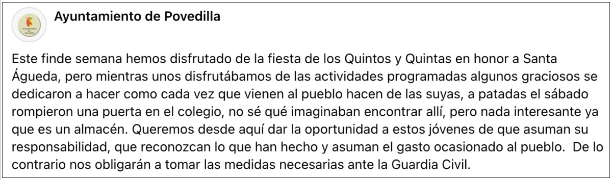 El Ayuntamiento de Povedilla (Albacete) ha denunciado públicamente un episodio de vandalismo ocurrido en el pueblo durante el pasado fin de semana, coincidiendo con la celebración de la fiesta de los Quintos y Quintas en honor a Santa Águeda. Según ha informado el Consistorio, un grupo de asaltantes –por el momento sin identificar– habría causado daños en una puerta del colegio municipal tras forzarla “a patadas” en la noche del sábado.