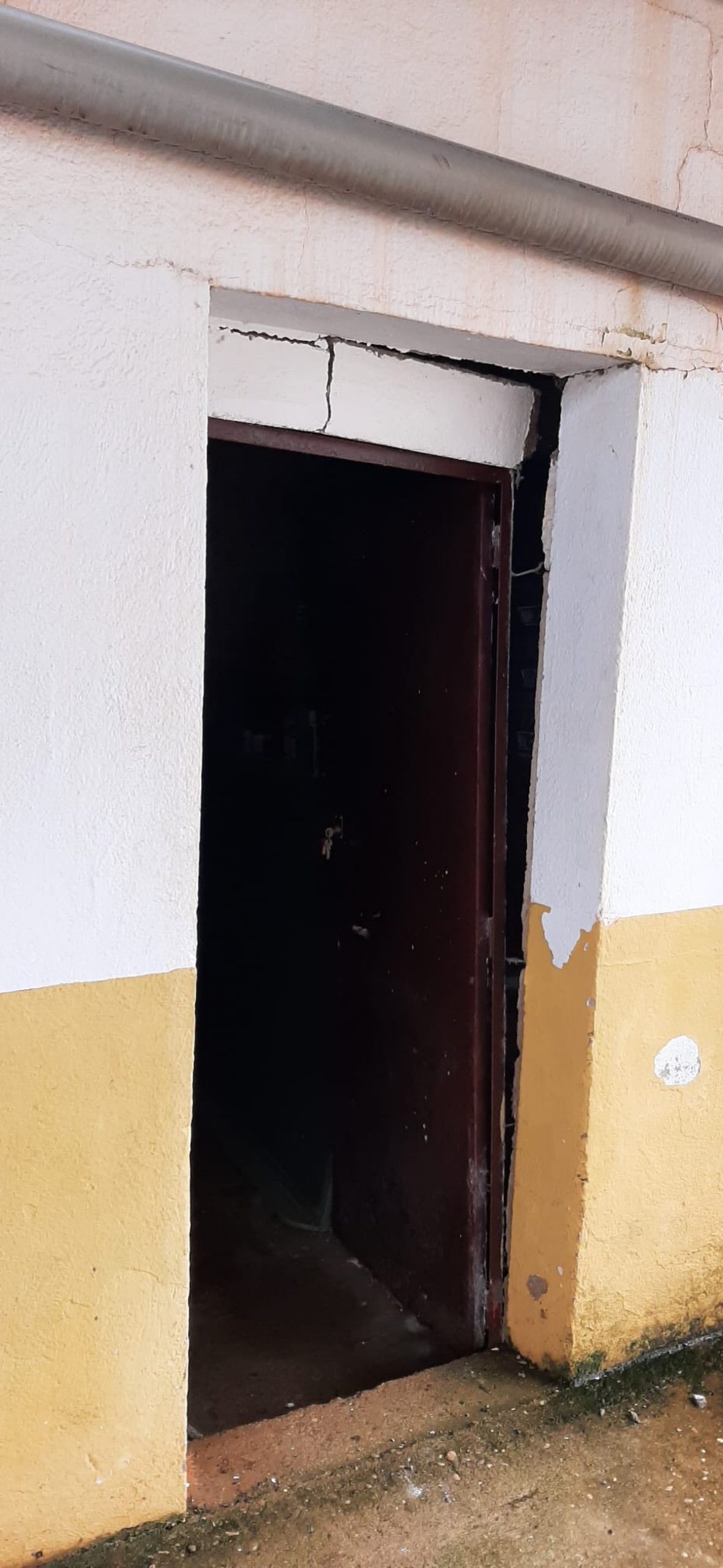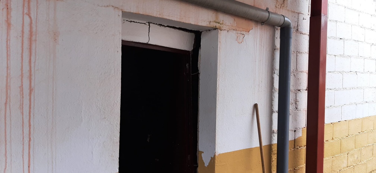 Los desperfectos se concentraron en un acceso que, de acuerdo con el relato municipal, conduce a un almacén del centro educativo. En las imágenes difundidas se aprecia un fuerte deterioro del marco y la estructura del hueco de la puerta, con roturas en el revestimiento, grietas en la zona superior del dintel y desprendimientos de material en el lateral, además de una clara desalineación del cerramiento.