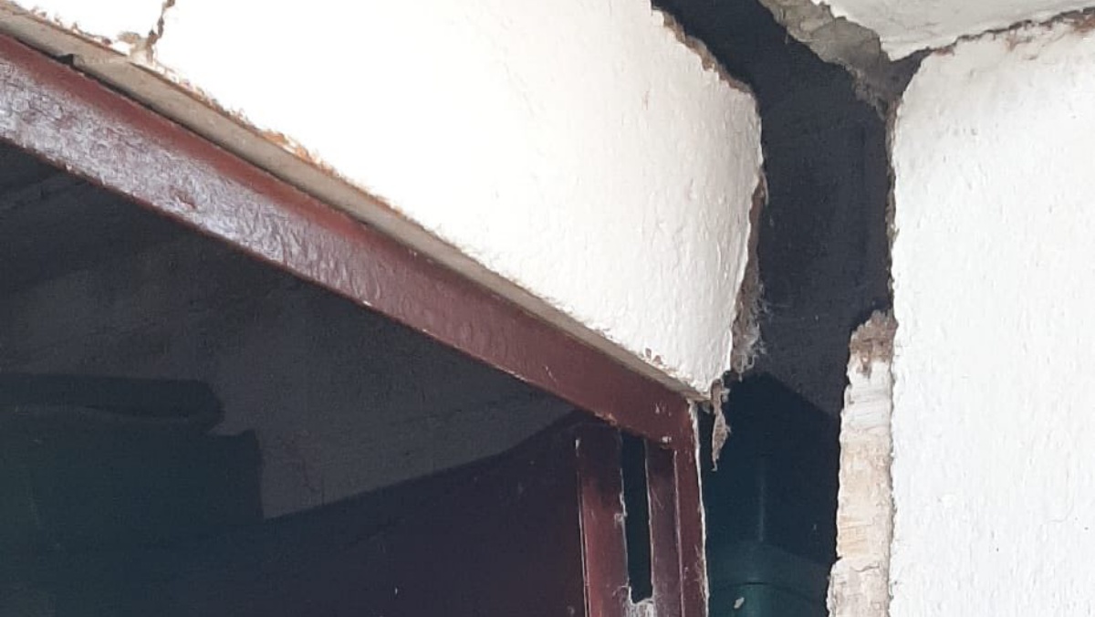 Los desperfectos se concentraron en un acceso que, de acuerdo con el relato municipal, conduce a un almacén del centro educativo. En las imágenes difundidas se aprecia un fuerte deterioro del marco y la estructura del hueco de la puerta, con roturas en el revestimiento, grietas en la zona superior del dintel y desprendimientos de material en el lateral, además de una clara desalineación del cerramiento.