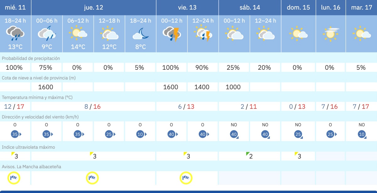 Además del viento, el cielo tampoco dará tregua. Para Albacete capital, la previsión muestra un viernes 13 claramente inestable, con probabilidad de precipitación del 100% en la primera mitad del día y del 90% por la tarde, con tormentas en ambos tramos horarios. El termómetro bajará: se esperan alrededor de 6 ºC de mínima y 13 ºC de máxima.