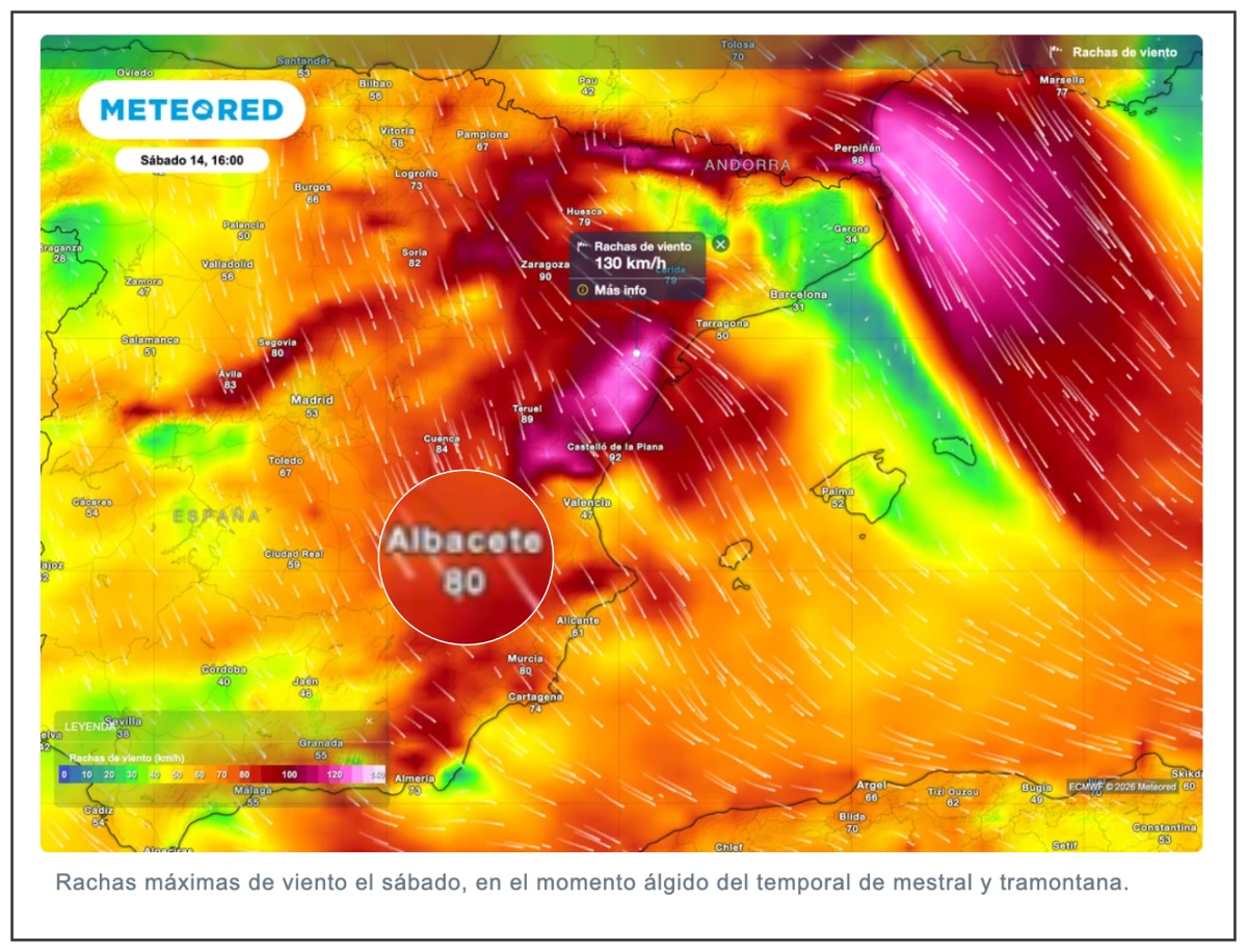 El viernes será, a escala nacional, una jornada de transición antes del repunte del sábado, cuando el temporal podría endurecerse por el efecto combinado de una ciclogénesis mediterránea y el avance del anticiclón por el oeste. Ese choque de presiones “aprieta” las isobaras y se traduce en vientos muy intensos en superficie, con la orografía amplificando el golpe en amplias zonas del este peninsular. En ese escenario, el propio pronóstico apunta a que Albacete figura entre las capitales donde podrían superarse rachas de 80 km/h, con la posibilidad de que en los próximos días se eleven los avisos si se confirma un empeoramiento.