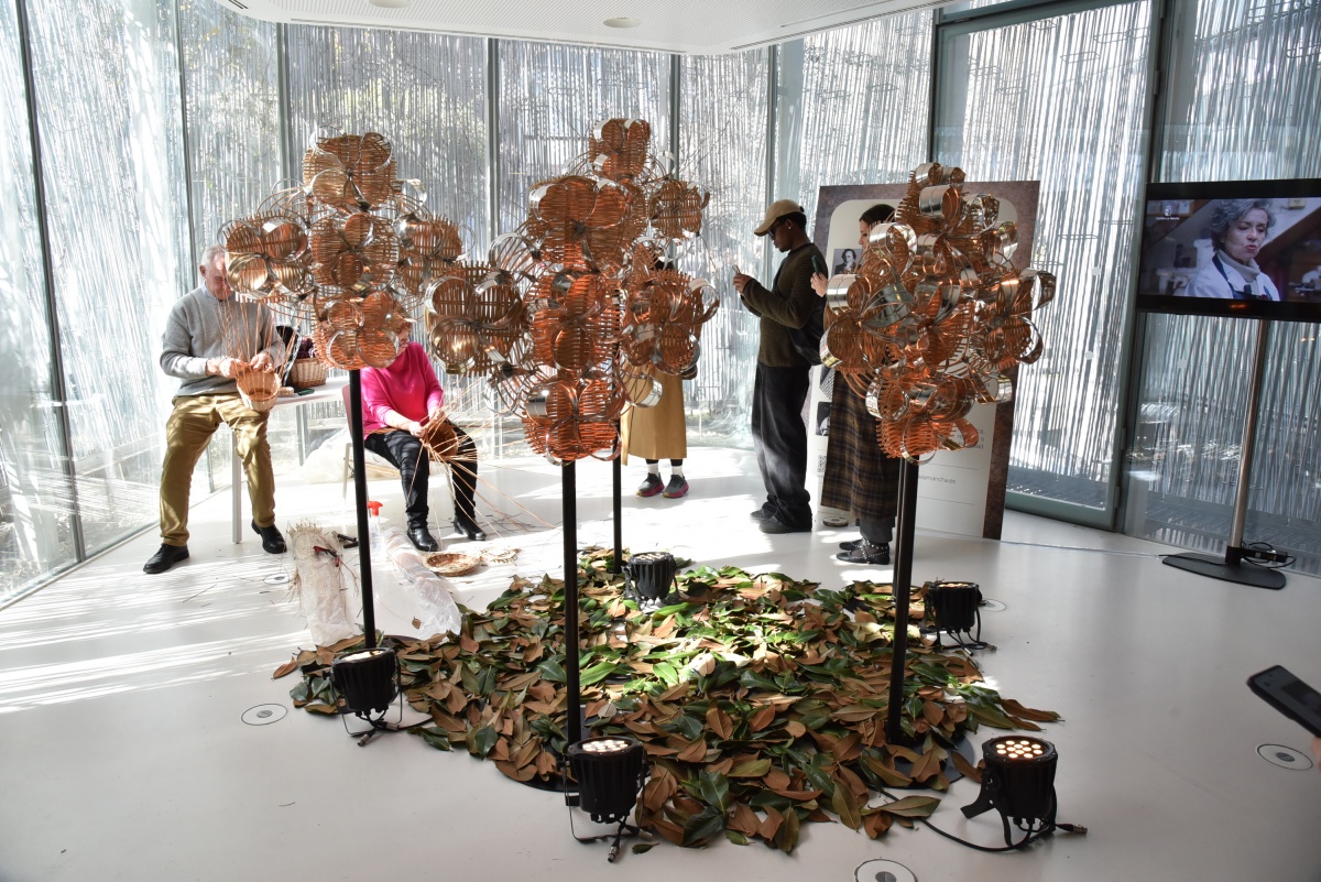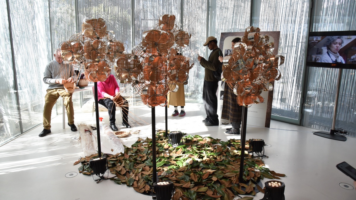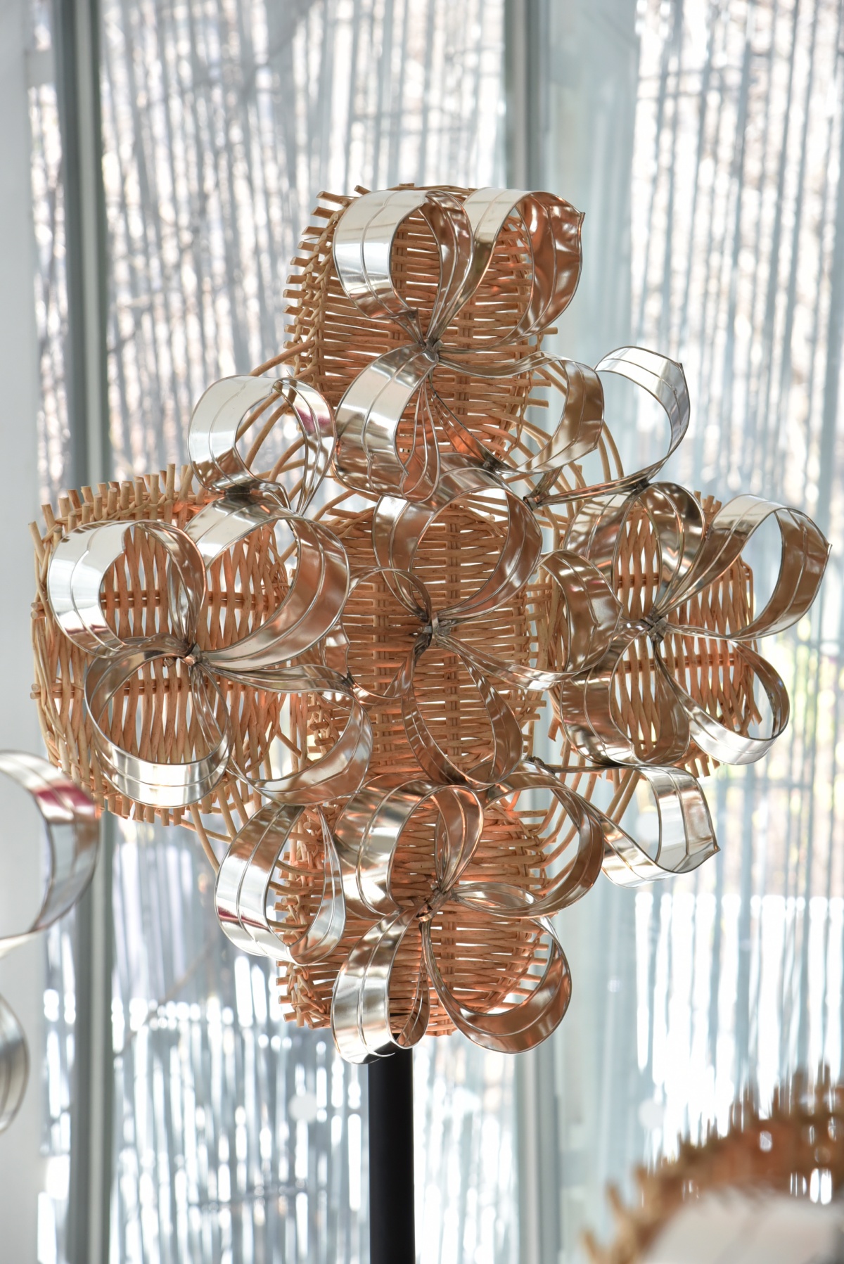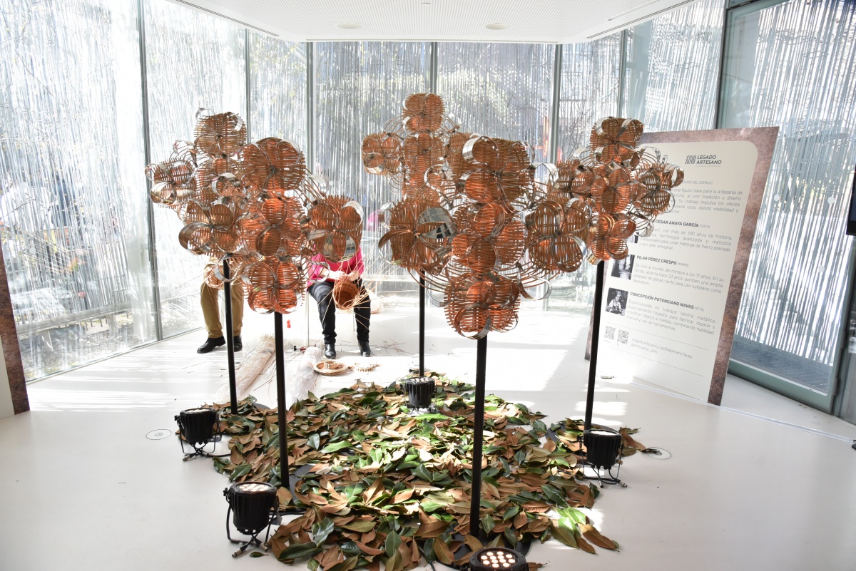 Concepción Potenciano, hojalatera; y Pilar Pérez Crespo, artesana del mimbre; sobre la forja de Julio César Anaya; convierten en realidad el diseño de Tomás Alía en ‘Materia Expandida’, el espacio con el que Castilla-La Mancha pone la bandera de su marca regional de artesanía en una de las citas nacionales con mayor calado internacional, Madrid Design Festival.