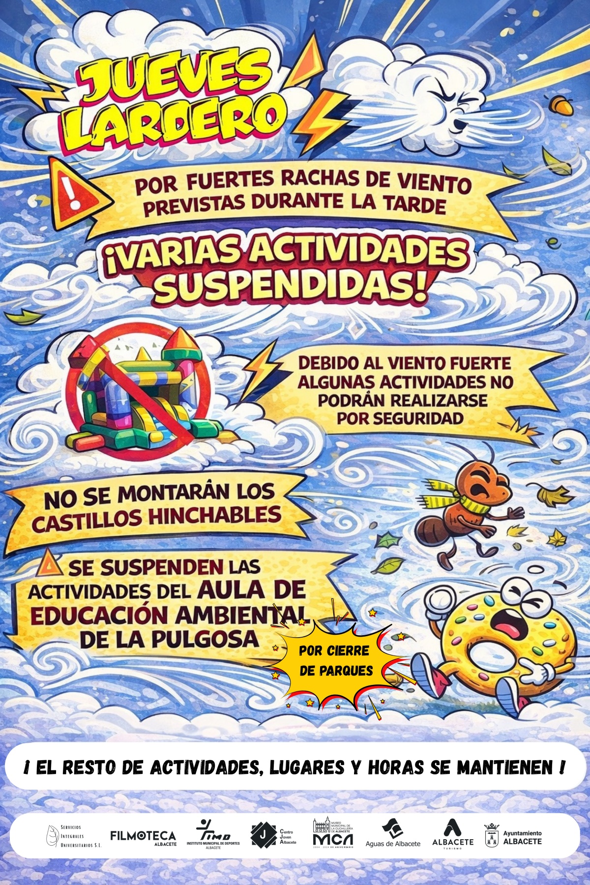 El Ayuntamiento de Albacete informa de nuevos cambios en la programación de Jueves Lardero debido a la alerta meteorológica decretada por la Agencia Estatal de Meteorología (AEMET) por rachas de viento de hasta 70 kilómetros por hora, una situación que, por motivos de seguridad, obliga a modificar y suspender algunas de las actividades previstas.