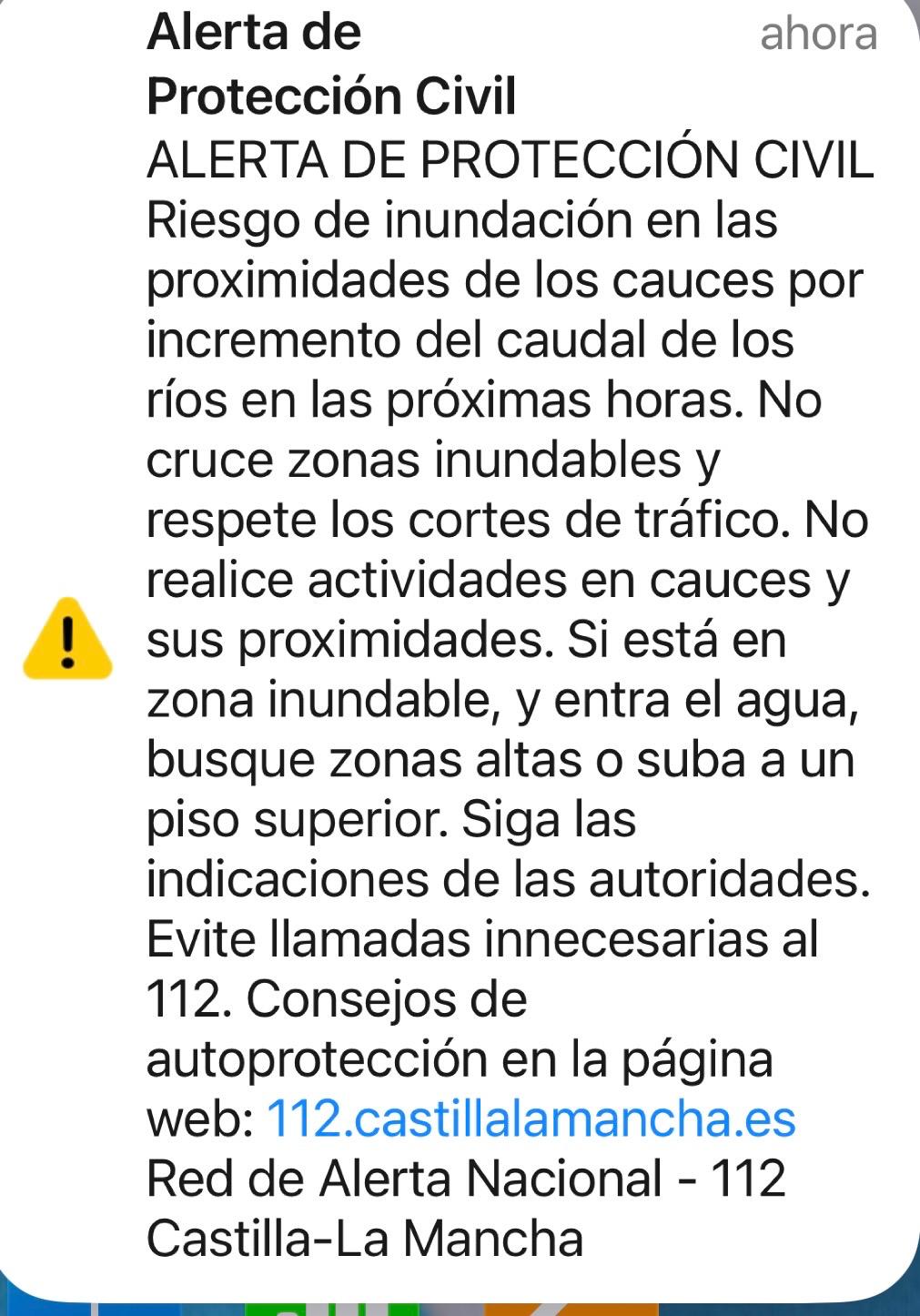 Riesgo de inundación en las proximidades de los cauces por incremento del caudal de los ríos en las próximas horas. No cruce zonas inundables y respete los cortes de tráfico. No realice actividades en cauces y sus proximidades. Si está en zona inundable, y entra el agua, busque zonas altas o suba a un piso superior. Siga las indicaciones de las autoridades. Evite llamadas innecesarias al 112. Consejos de autoprotección en la página web: 112.castillalamancha.es