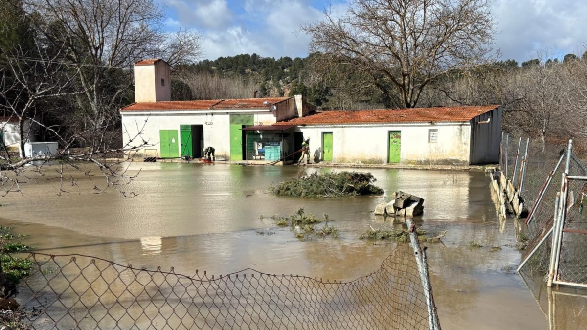 Efectivos del Servicio Especial de Prevención y Extinción de Incendios (SEPEI) de la Diputación de Albacete trabajan desde primera hora de este jueves en la pedanía de El Jardín, donde el aumento del caudal del río Jardín —que permanece en aviso rojo— ha provocado un desbordamiento puntual que está afectando a la piscifactoría de El Zarzalejo.