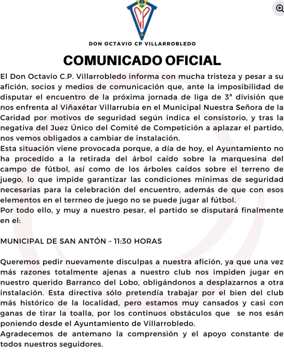 Del mismo modo, han aclarado que finalmente el partido “se disputará finalmente en el Municipal de San Antón a las 11:30 horas”. En este punto, pedían disculpas a su afición, ya que “una vez más razones totalmente ajenas a nuestro club nos impiden jugar en nuestro querido Barranco del Lobo, obligándonos a desplazarnos a otra instalación”, aseguraban, y manifestaban que “la directiva sólo pretendía trabajar por el bien del club más histórico de la localidad, pero estamos muy cansados y casi con ganas de tirar la toalla, por los continuos obstáculos que se nos están poniendo desde el Ayuntamiento de Villarrobledo”.